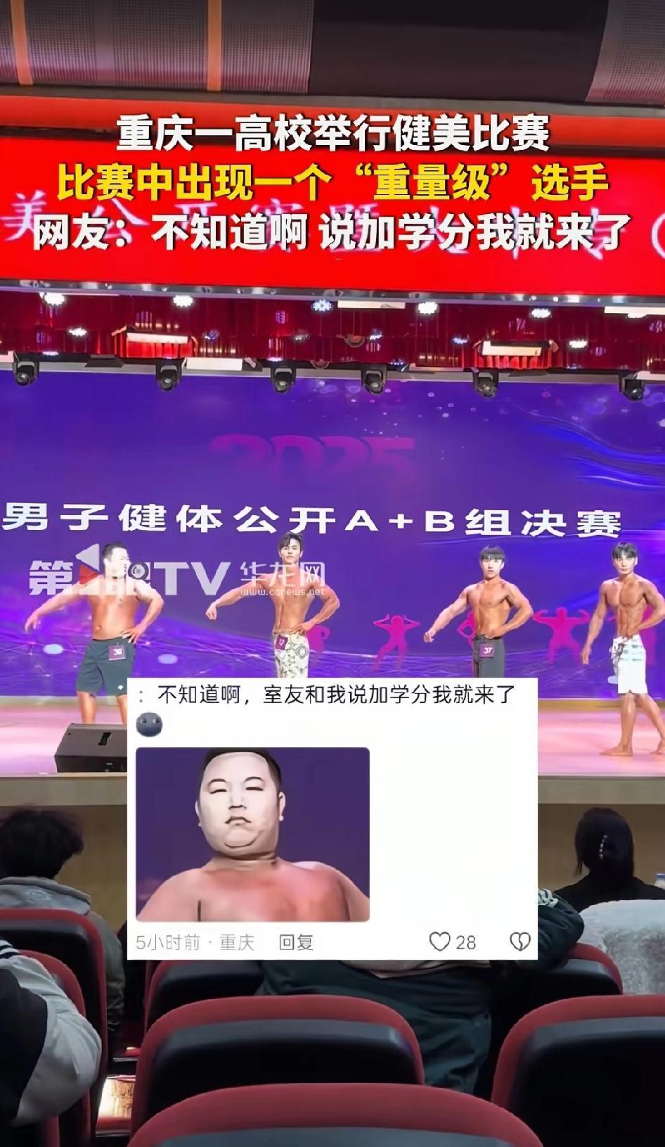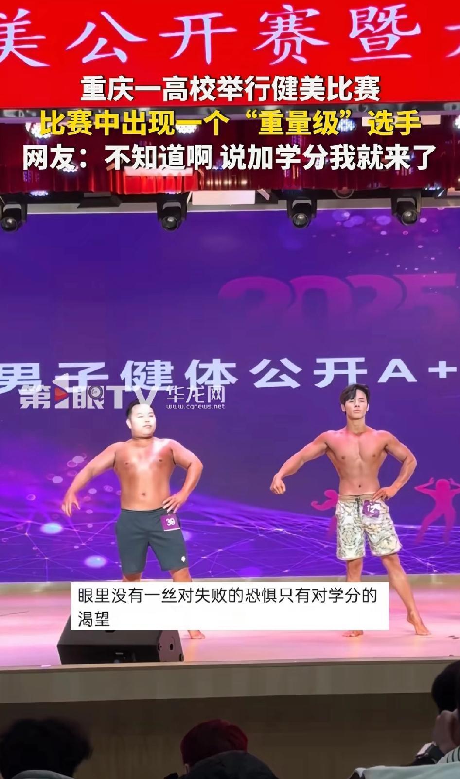 “笑不活了!”重庆一所高校的健美比赛火了。舞台上,一位体型圆润的男生自信站在其中,动作有模有样,眼神里没有紧张,只有“为了学分冲”的坚定。 他是“重量级选手”别人有着耀眼的肌肉。他没有自卑,而是自信满满。其他选手忍不住想笑。这段画面很快在网上传开,没别的,就是这份反差感和真实感太戳人。 网友热议,有网友说:“最厉害是他,把全部肌肉练成一块。” 还有网友说:“身材这块可以见仁见智,气势这块我不输任何人。” 也有网友说:“想起大一那会儿,班里每个人算学分,只要有参加课外活动,不管有没有奖,参与就能加学分,什么志愿者,做过的兼职,元旦万人马拉松,只要报名参加,都能加分。” 谁的青春里没有为了学分“勇闯各种局”的经历?可能是硬着头皮参加的辩论赛,可能是熬夜准备的社团活动,也可能是像这位同学一样,明明和“健美选手”的标签不那么贴合,却还是为了那几分“福利”站上舞台。 没有完美的身材,没有专业的训练,只有“来都来了”的勇气和不扭捏的坦率,反而成了全场最亮眼的存在。 这才是青春该有的样子:不用完美,不用端着,为了一个小小的目标大胆尝试,哪怕有点“社死”,也是往后想起来会笑的回忆。