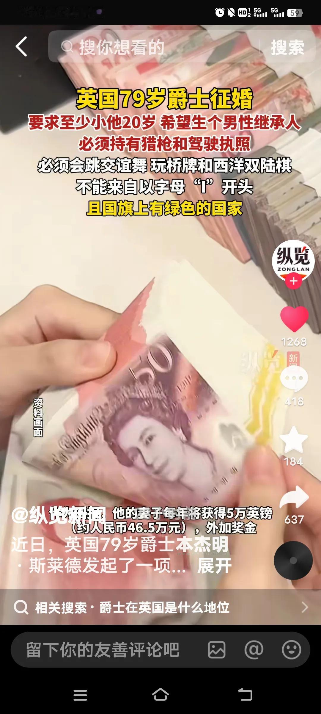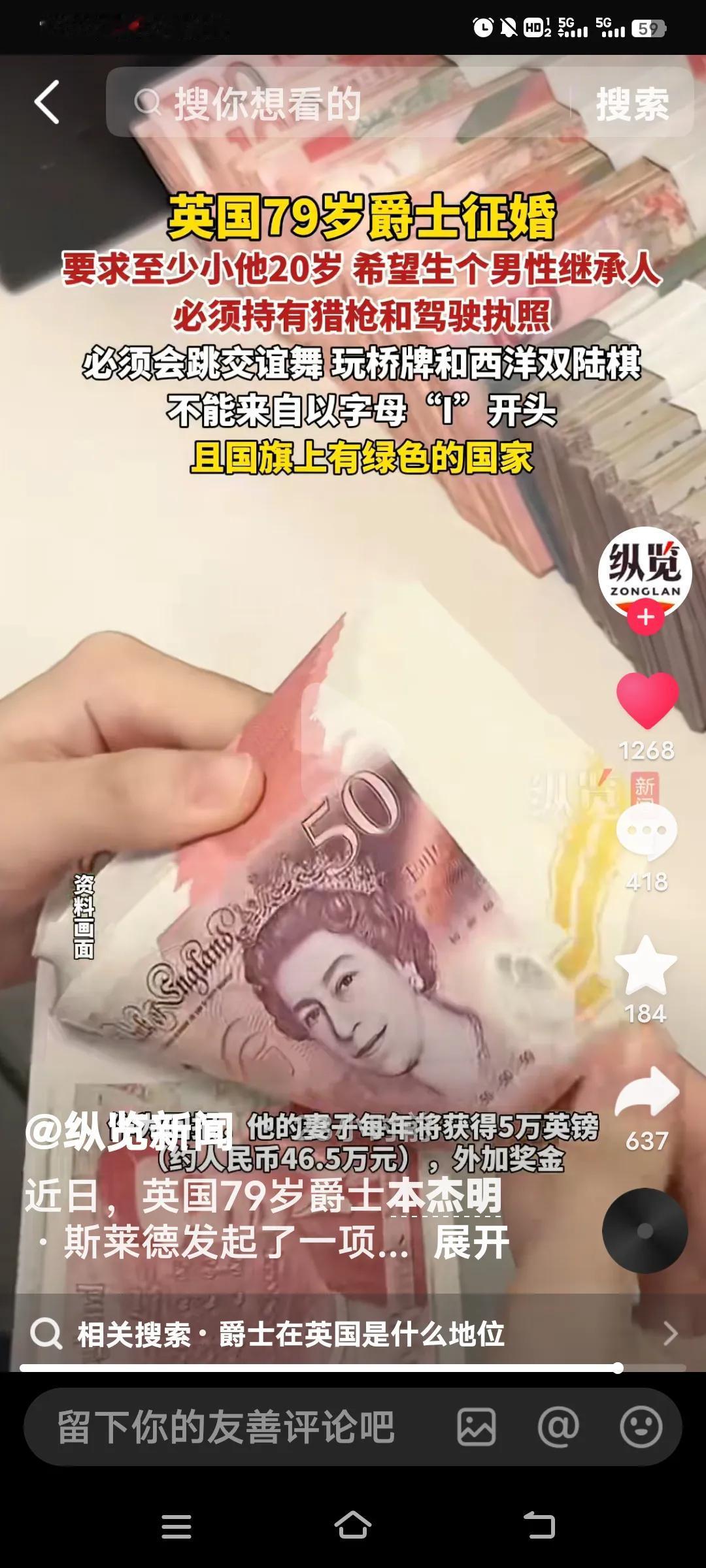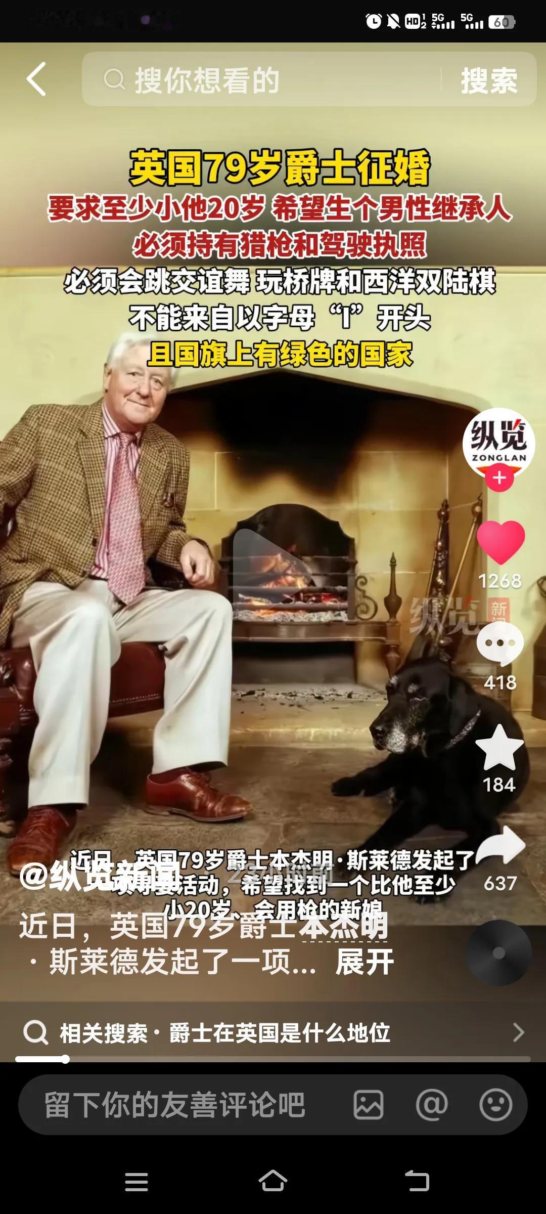 英国这79岁爵士本杰明·斯莱德征婚,要求可真够奇葩的。得比他小20岁,不能是天蝎座,不能来自特定国家,还不能吸毒酗酒。要会用枪、会跳交谊舞、玩桥牌和西洋双陆棋,会做填字游戏,能大量体育锻炼、会游泳,得有猎枪和驾驶执照,有直升机驾驶执照更佳,还得能管理两座城堡和庄园。 他这么多要求,原来是想找个能为他生男性继承人的。他之前感情不顺,几段感情都没孩子。虽说他给妻子每年5万英镑,但这条件,感觉是在“万里挑一”啊,不知道能不能找到符合标准的人。 感觉实在是过分高傲了,看不到自己的弱点终究难免成功,小20岁的也59岁了哪还有这么多优点,再生育,这可能吗?