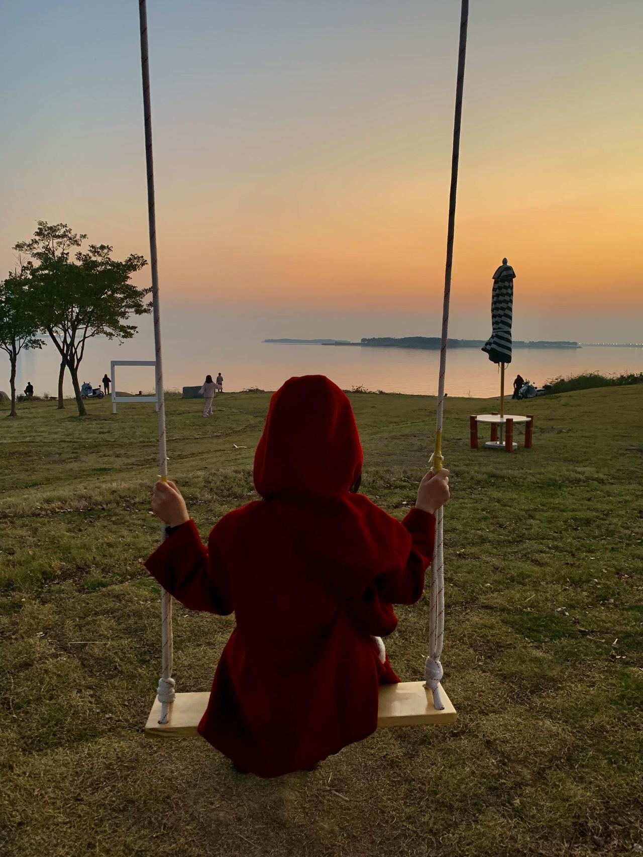 日落时刻🌄在omitofee, 下午来的时候刚好遇到日落🌄 在门口可以荡秋千, 真的很惬意😌 还有很多可爱的小狗狗们~ 夜景也是很美,开心的一天