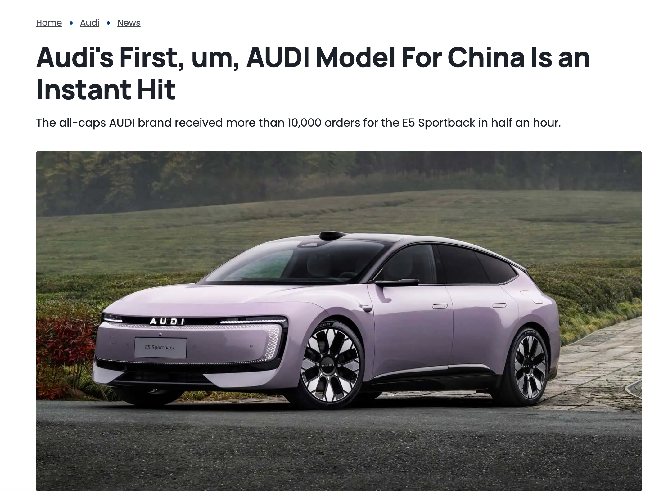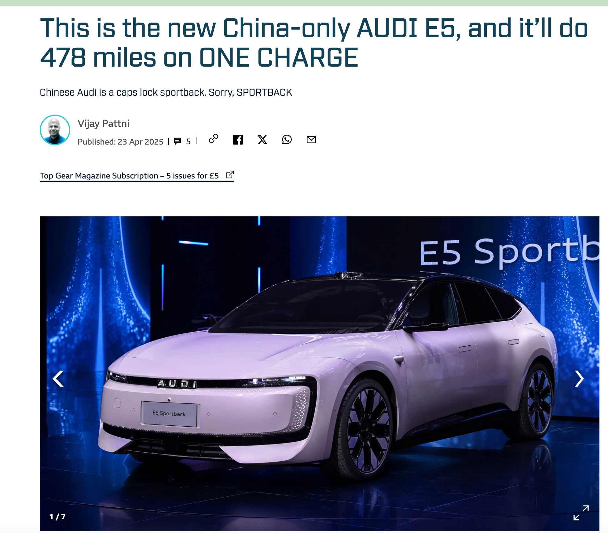 媒体整体对 E5 Sportback评价蛮高的,算是为“best of both worlds”(德中融合巅峰),尤其适合追求科技与实用的中国消费者。但除了在国内销售外,若想全球认可,需优化 NVH 和血统感。Top Gear:“Shouts intentions from the rooftops... 478 miles on one charge”(高调亮相,续航惊人)InsideEVs:“ exceeds Western Audis”(订单火爆,超越奥迪欧洲车型)CarScoops:“770 HP wagon... LiDAR for urban challenges”(高功率,适应中国城市)Motor1:“low price, no corners cut”(即时爆款,性价比高)CarThrottle,“China-only... 776bhp in 3.4s”(中国专属,性能炸裂)Edison (德国)“Der Audi, der keiner sein will... fresh lines”(非传统 Audi,新鲜设计)
