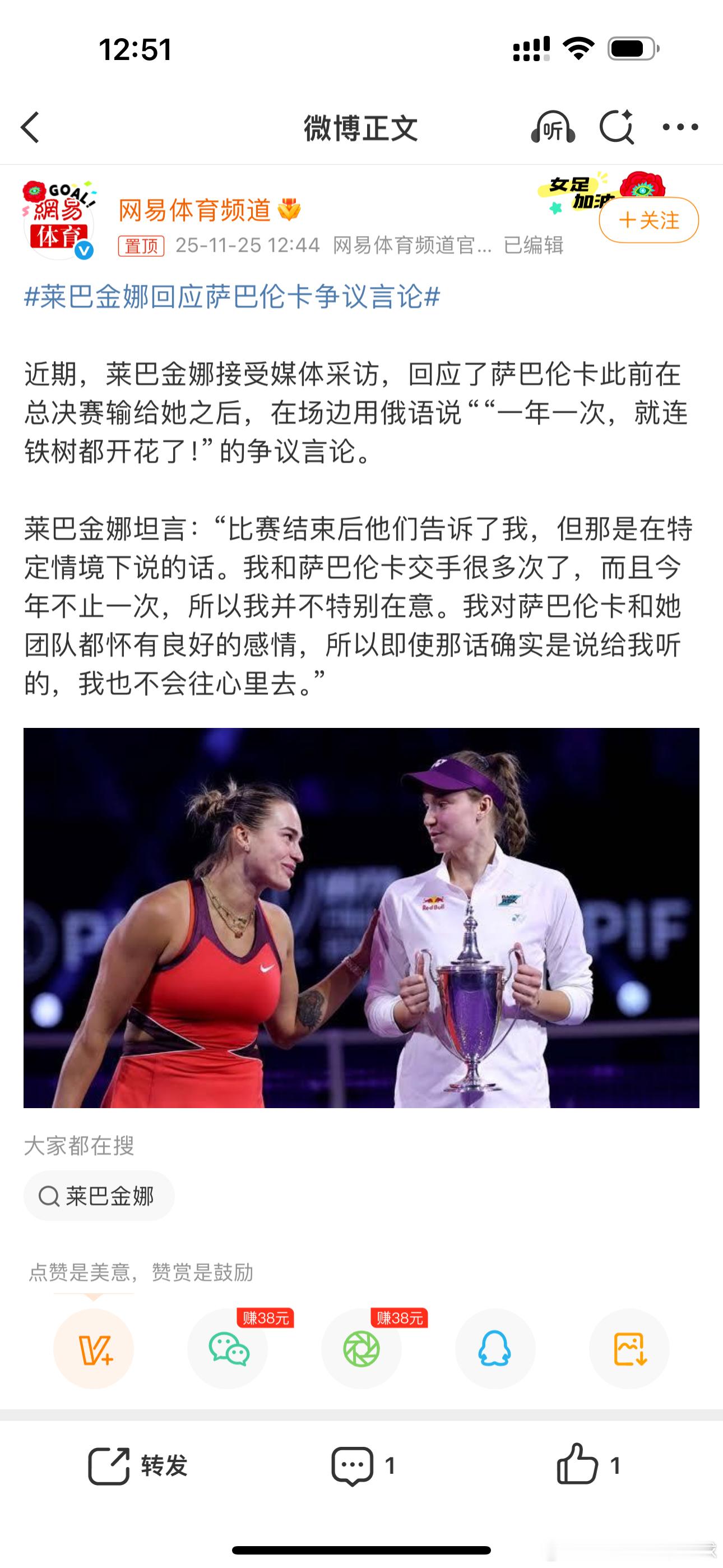 近期,莱巴金娜接受媒体采访,回应了萨巴伦卡此前在总决赛输给她之后,在场边用俄语说““一年一次,就连铁树都开花了!”的争议言论。莱巴金娜坦言:“比赛结束后他们告诉了我,但那是在特定情境下说的话。我和萨巴伦卡交手很多次了,而且今年不止一次,所以我并不特别在意。我对萨巴伦卡和她团队都怀有良好的感情,所以即使那话确实是说给我听的,我也不会往心里去。”人美心善的莱巴金娜啊