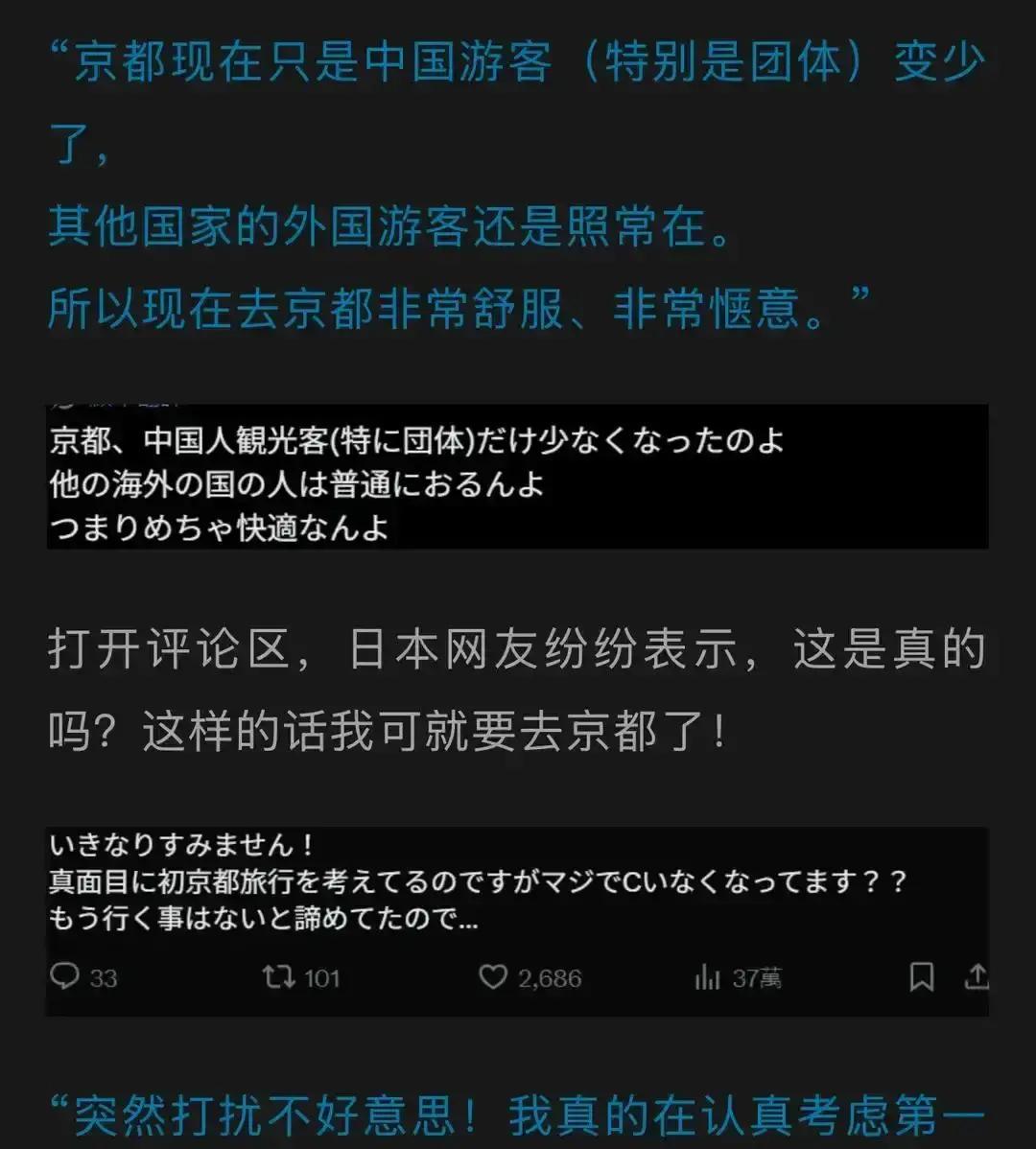 果不其然。日本各地的酒店和商家突然宣布了:中国游客的团体订单连番取消,热门景点人流一下子降了大截,京都、东京、北海道都在叫冷。顺着这个消息往下聊,京都正值红叶季,往年电车挤到扶手都握不上,这回居然拍到“空车”。发帖人感受是中国游客少了差不多七成,喧闹没了、安静回来了,日本网友一片“舒服”,可做中国人生意的和服店、土特产店、民宿却开始关门。 京都东山脚下有间叫“竹之屋”的民宿,老板佐藤做这行快十二年了。往年红叶季,他的八间房提前俩月就被中国旅行团订满,每天天没亮就得起来煮味噌汤,门口的和服租赁铺老板娘还会送他自制的大福,说“托中国客人的福,我这月提成比工资高”。现在呢?佐藤翻着预约本,最近十天只有三单本地客人,还是一对退休老夫妇。墙上挂的“中国游客最喜爱民宿”铜牌落了灰,他之前特意学的“你好”“谢谢”“这边请”,已经快俩月没说过了。 上周,隔壁开了六年的土特产店贴了转让告示。老板是个五十岁的阿姨,以前总跟佐藤吐槽“中国客人太能买,我打包到手软”,现在拉着他叹气:“再撑半个月,撑不住就回九州种草莓。”佐藤自己也愁,房租每月二十五万日元,现在收入连十分之一都不到,去年贷的款还欠着八十万。他试着发本地游客九折优惠,可日本人红叶季爱往人少的乡村跑,东山这种“曾经的热门”反而没人来。 那天他刷社交平台,看到日本网友的评论:“终于能安静赏红叶了”“不用听中文吵吵了”,还有人晒空电车照片配文“这才是红叶季该有的样子”。佐藤心里堵得慌,这些人只看见空街空车的舒服,没看见像他这样的小商家正在断粮。去年核处理水排海那天,他手机响了三十多回,全是中国客人取消订单的消息,从那以后生意就直线往下掉。 佐藤想过转行,比如开小餐馆卖乌冬面,但他没做过餐饮,怕赔得更惨;或者去大阪找份快递员工作,可他膝盖不好,扛不动重包裹。他常坐在民宿门口的竹椅上发呆,以前这里满是举着相机拍红叶的中国游客,现在只有偶尔路过的学生。他不知道自己还能撑多久,也不知道日本观光业啥时候能缓过来。 其实这事根本不复杂,安静和生意本来就不冲突,但前提是得解决游客的顾虑。核排是绕不开的坎,游客担心安全,再便宜也不敢去。光喊“欢迎”没用,得拿出实在行动让大家放心。那些喊“舒服”的网友,要是自家店没生意要关门,恐怕也笑不出来。佐藤只希望,日本能早点正视问题,不然像他这样的小商家,只会越来越多关门大吉——到时候,街上可能不止安静,还会满是冷冷清清的转让牌