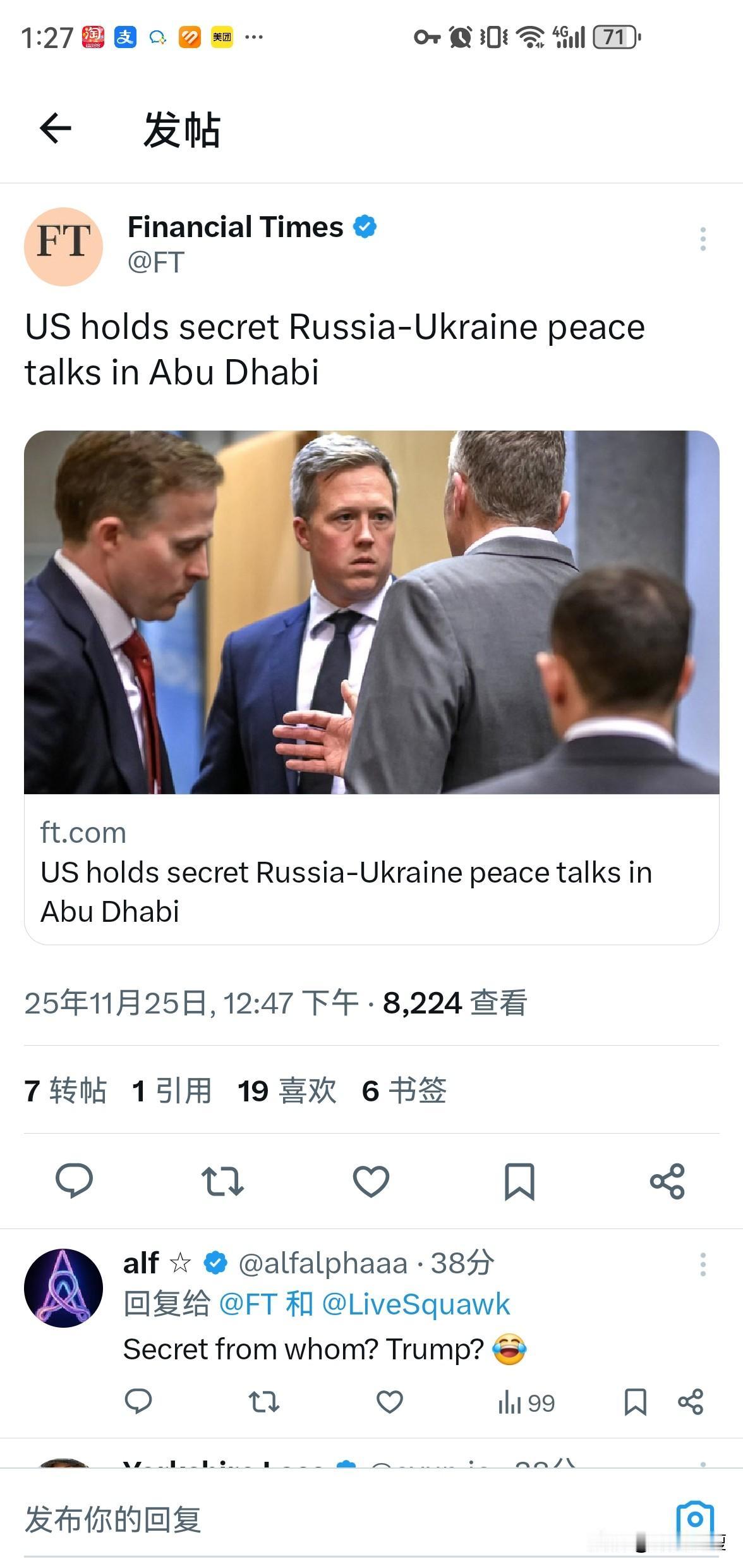 最新,美国在阿布扎比举行秘密俄乌和平会谈——终于来了,俄罗斯🇷🇺与乌克兰🇺🇦最高级人员坐在一起推进和平谈判。 英国《金融时报》刚刚放消息,美国陆军部长丹·德里斯科尔正在阿联酋阿布扎比与乌克兰军事情报局局长基里洛·布达诺夫和俄罗斯代表团举行会谈,华盛顿方面正努力推动一项旨在结束俄乌战争的和平协议。 现在人人都知道你们在谈了,那也就不是秘密了,要是再谈崩一次有人面子上就真挂不住喽。
