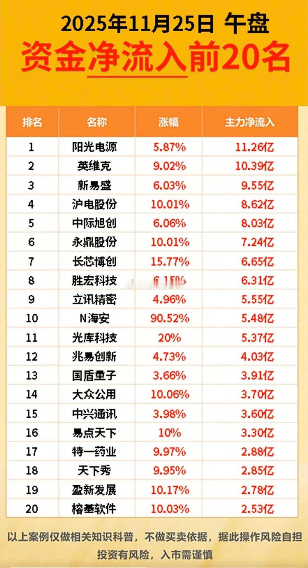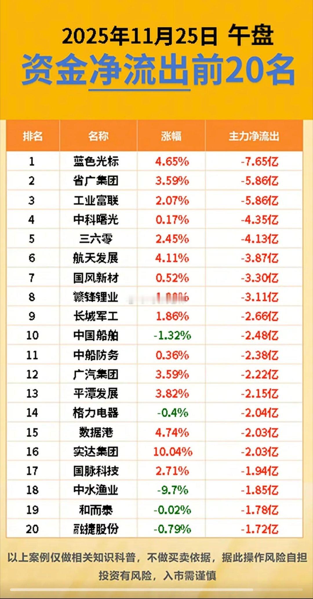 11.25周二 主力大资金 流向 TOP20!电网设备,贵金属,消费电子,半导体,电池相关,小金属等资金流入。军工反制,船舶,航空机场,ai智能体等资金流出较多