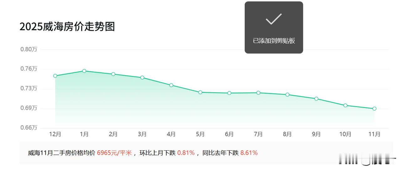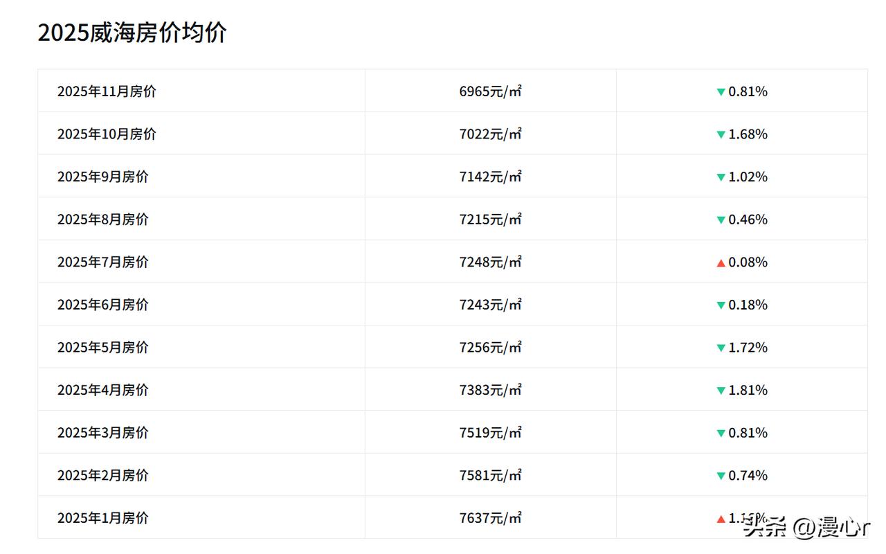 2015年10月,山东威海房价均价5502元; 2016年10月,山东威海房价均价5874元; 2017年10月,山东威海房价均价7994元; 2018年10月,山东威海房价均价10199元; 2019年10月,山东威海房价均价10044元; 2020年10月,山东威海房价均价9616元; 2021年10月,山东威海房价均价9486元; 2022年10月,山东威海房价均价8928元; 2023年10月,山东威海房价均价8635元; 2024年10月,山东威海房价均价7669元; 2025年10月,山东威海房价均价7022元。 数据说明:以上均价数据,均来自安居客、房天下、58同城数据,只是作为数据分析的参考,旨在反映威海房价近十年的走势,不能准确映射当地实际房产价格。因为新房、二手房、不同区域不同位置、不同楼层和装修的房价差别较大,占比也不同,仅通过一个均价不能一概而论。下面漫心r就把整理出来的数据进行一个初步的分析,和大家分享一下感受: 今天聊一聊威海楼市这十年,数据摆在眼前,故事藏在里面,我梳理了从2015年到2025年,每年10月的威海房价均价,一起来看看这条曲线背后,市场到底发生了什么。 2015年至2018年,房价从5502元涨到10199元,几乎几乎翻了一番,这三年是威海楼市的黄金时期,属于卖方市场,背后有棚改货币化、品牌房企入驻、海景房概念升温等多重因素在推动。 2019年以后,房价开始持续下降,买方市场特征越来越明显,2025年10月威海新房成交均价11836元,二手房均价7524元,这种明显的价格倒挂,一方面说明新房市场价格相对坚挺,另一方面也反映二手房市场的议价空间更大。 从58同城数据看,威海不同区域间的价差比较明显。经区和高区的二手房均价相差不大,分别为8273元和8205元。但具体到个别优质学区、完善配套的热点板块,价格抗跌性会非常明显。 从中指研究院的月报来看,2025年10月威海商品住宅成交面积同比下降32.1%,成交套数下降36.27%。说明市场去库存压力不小。 写在最后,漫心r个人观点:结合全国房价走势,威海房价短期内可能会基本维持稳定,不会出现大涨大落。市场的真正回暖,最终还需要依赖整体经济环境的改善和购房者信心的提升。总体而言,房子本身是商品,它的属性是居住,购房者一定要结合自己的核心需求和实际购买能力,适合自己的才是最好的。