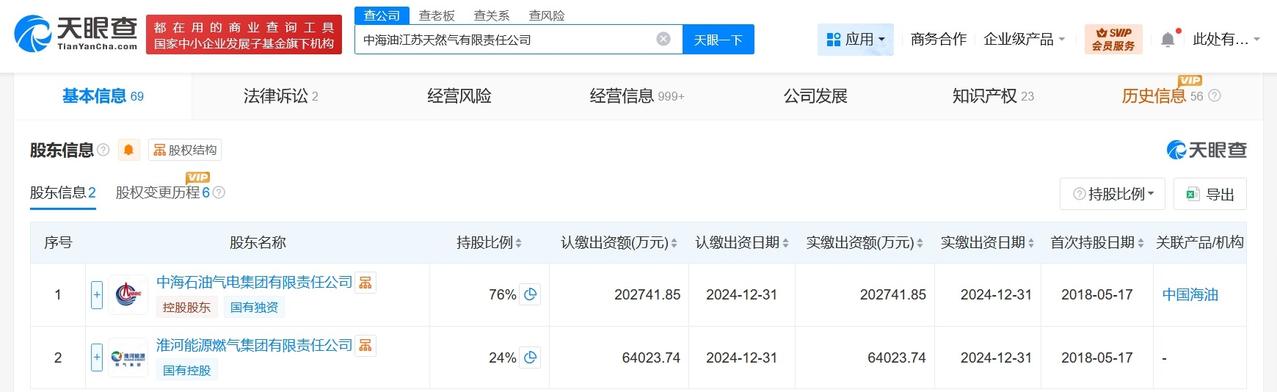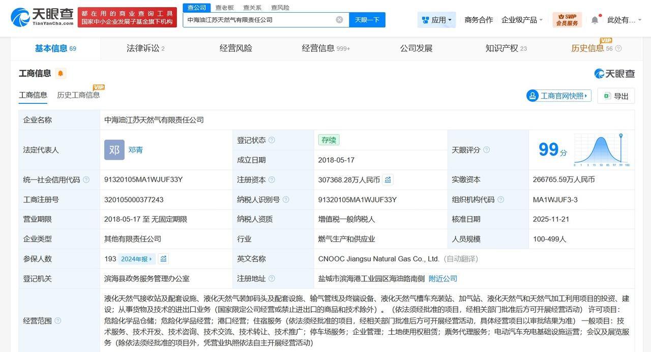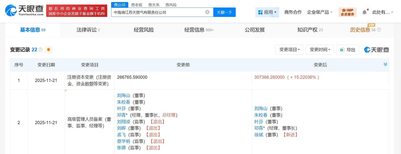 中海油江苏天然气公司增资至约30.7亿增幅约15% 天眼查工商信息显示,近日,中海油江苏天然气有限责任公司发生工商变更,注册资本由约26.7亿人民币增至约30.7亿人民币,增幅约15%,同时,多位高管发生变更。 该公司成立于2018年5月,法定代表人为邓青,经营范围含液化天然气接收站及配套设施、液化天然气装卸码头及配套设施、输气管线及终端设备、液化天然气槽车充装站、加气站、液化天然气和天然气加工利用项目的投资、建设等。股东信息显示,该公司由中海石油气电集团有限责任公司、淮河能源燃气集团有限责任公司共同持股。 天眼查信息: