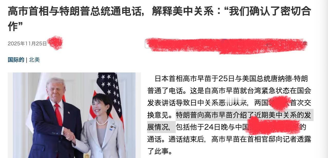 特朗普紧接着致电高市早苗不同寻常!显然这把尺子掌握在中美手中,日本注定沦为大国博弈的棋子。 这个时机太耐人寻味,日本人还沉浸在中美谈话里还没缓过来,紧接着特朗普就要打电话给高市早苗,日本人对此也感到很震惊!显然中美通话是冲着日本来的。日本网友都在怀疑:特朗普是不是要给高市早苗立规矩了? 据日本媒体的报道称,特朗普向高市早苗介绍了近期美中关系的发展情况,还讨论了台湾问题。这句话虽然不起眼,但内涵很多,意义重大。 显然中美关系不容许被破坏,也不容许日本在这个节骨眼上给中美关系上眼药水。因为中美刚刚在韩国修复了因关税问题而被破坏的两国关系,因此特朗普并不想在此刻因日方的挑衅而破坏这来之不易的中美关系,因为这关系到美国经济利益所在。这就是这句话的意义所在。显然特朗普透过这些话是在给高市早苗立规矩。 高市早苗的心思,美国人看的很清楚,她说那番话显然也是在测试美国的态度,想离间中美关系,更是想把美国拉下水。日本想利用美日安保条约锁死美国,那她想的就太天真了。孙猴子崩得再高,也逃不出如来的手掌心。高市早苗想利用台湾问题上蹿下跳,以为美国是她的靠山,那也是大错特错。这把尺子始终掌握在中美手中。日本人逃不出中美的手掌心的,注定沦为大国博弈的棋子。 接下来,高市早苗若不收回有关台湾问题的挑衅言论,以缓和当前紧张的局势,中方可能会采取进一步措施。这也是中美通话的意义所在。就是在警告日本到了知错必改的时候了。美方若劝不住,那就别怪中方不客气了。高市早苗内阁 美日关系 中美通话