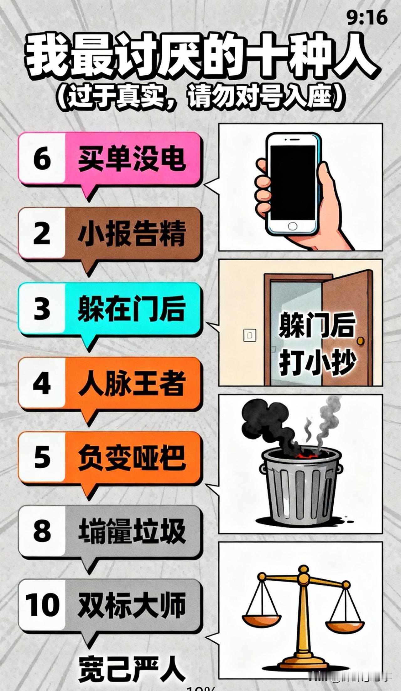 最讨厌的十种人(过于真实,请勿对号入座) 1. 消息发“在吗?”然后就消失的人 不在,不出意外的话,这几十年我都不会在了。 2. 借钱时是孙子,还钱时成大爷的人 我的钱不是大风刮来的,但像是大风刮走的。 3. 整天把“我可都是为了你好”挂嘴边的人 谢谢,但请你对我坏一点,让我清净会儿。 4. 上班摸鱼邀功第一,甩锅更快的人 活儿是一点不干,功劳是一件不落。 5. 开车加塞还狂按喇叭,觉得全马路都该让他的人 怎么,你的时间是时间,别人的命就不是命吗? 6. 聚餐永远喊着“我来买单”,最后却“手机没电”的人 演技这么好,奥斯卡小金人知道吗? 7. 自己摸鱼却打小报告,说别人工作不努力的人 卷又卷不赢,甩锅第一名。 8. 炫耀自己人脉广,真有事找他秒变哑巴的人 开口就是“我认识谁”,闭嘴就是“这忙不好帮”。 9. 成天传播负能量,把所有人当情绪垃圾桶的人 我的心情很好,直到你开始跟我说话。 10. 双标玩得溜,宽于律己,严于待人的人 对别人是马克思主义,对自己是自由主义 大家觉得呢,评论区讨论起来[吃瓜群众]
