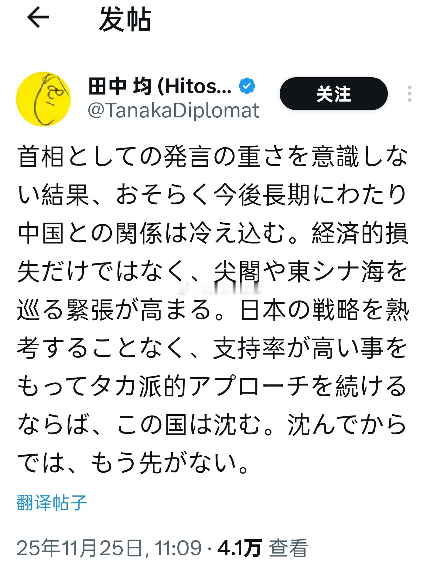 曾任日本外务副大臣的田中均再次批评高市:“作为首相,如果没有意识到其发言的分量,那么很可能在今后很长一段时间内,中日关系将持续冷却。这不仅是经济上的损失,更会导致围绕钓鱼岛及东海的紧张局势升级。如果不深思熟虑日本的战略,而仅仅因为支持率高就继续采取鹰派的做法,这个国家将会沉没。而一旦沉没,就再也没有回头路了”。