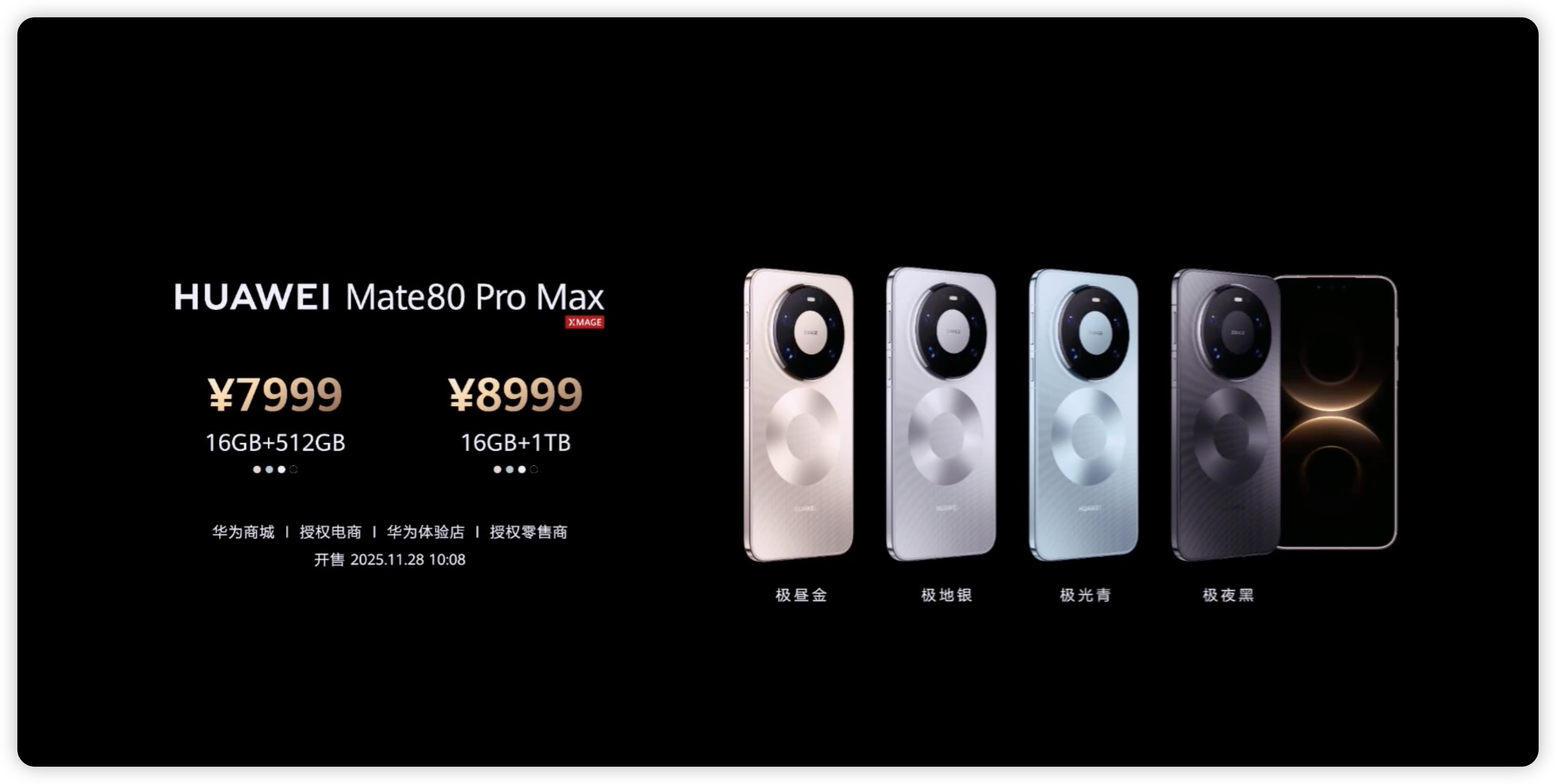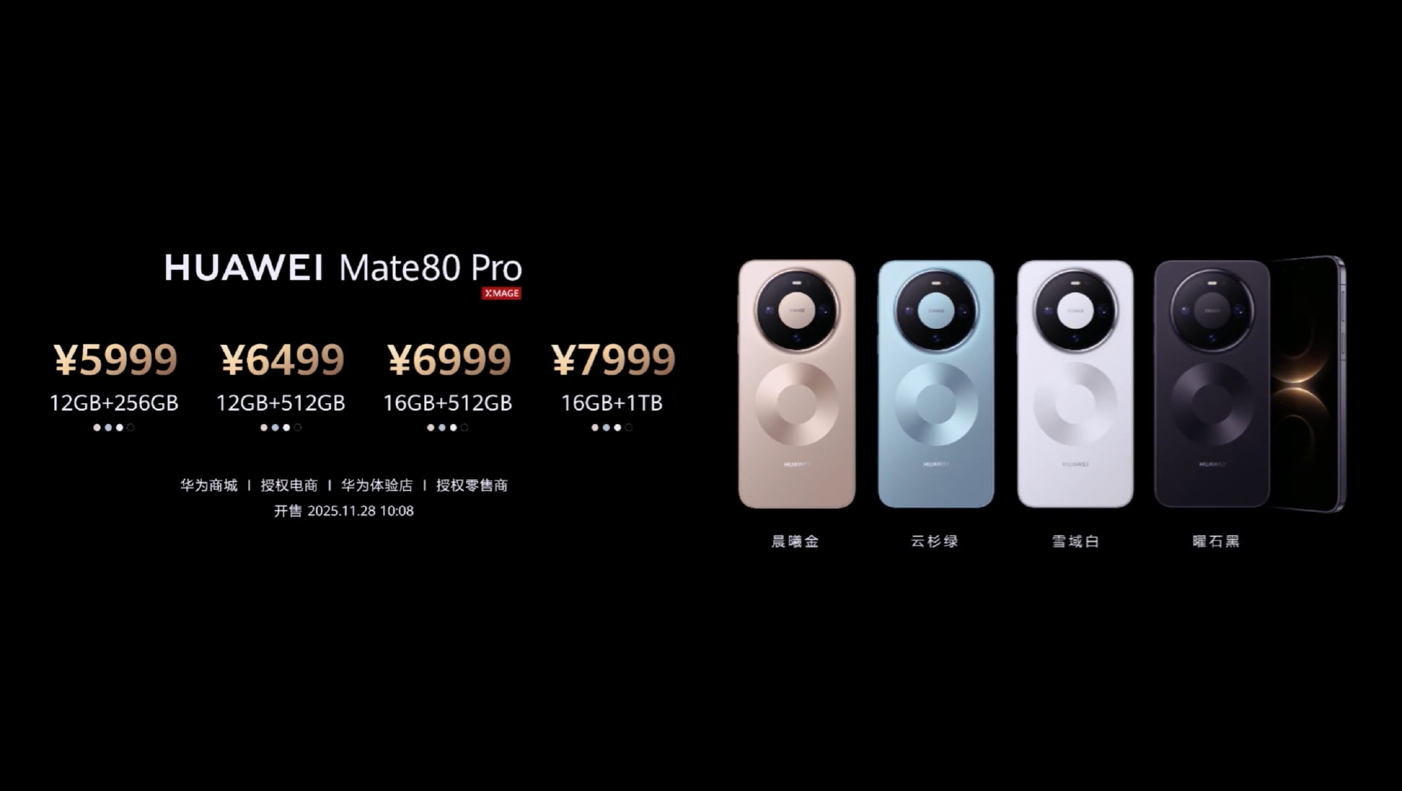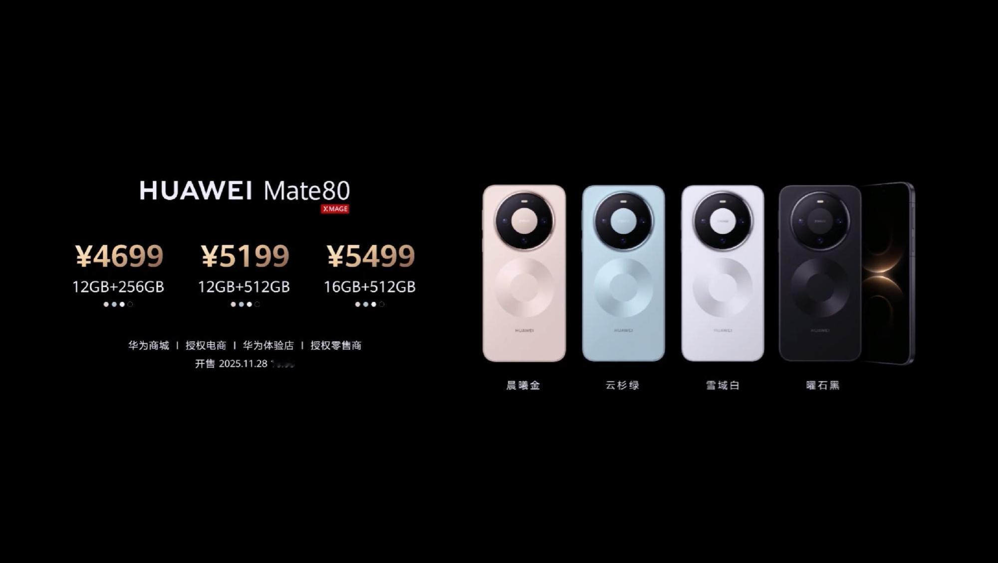 华为 Mate80 系列正式发布了,¥4699 起售Mate8012+256GB,¥469912+512GB,¥519916+512GB,¥5499Mate80 Pro12+256GB,¥599912+512GB,¥649916+512GB,¥699916+1TB,¥7999Mate80 Pro Max16+512GB,¥799916+1TB,¥8999Mate80 RS 非凡大师20+512GB,¥1199920+1TB,¥12999