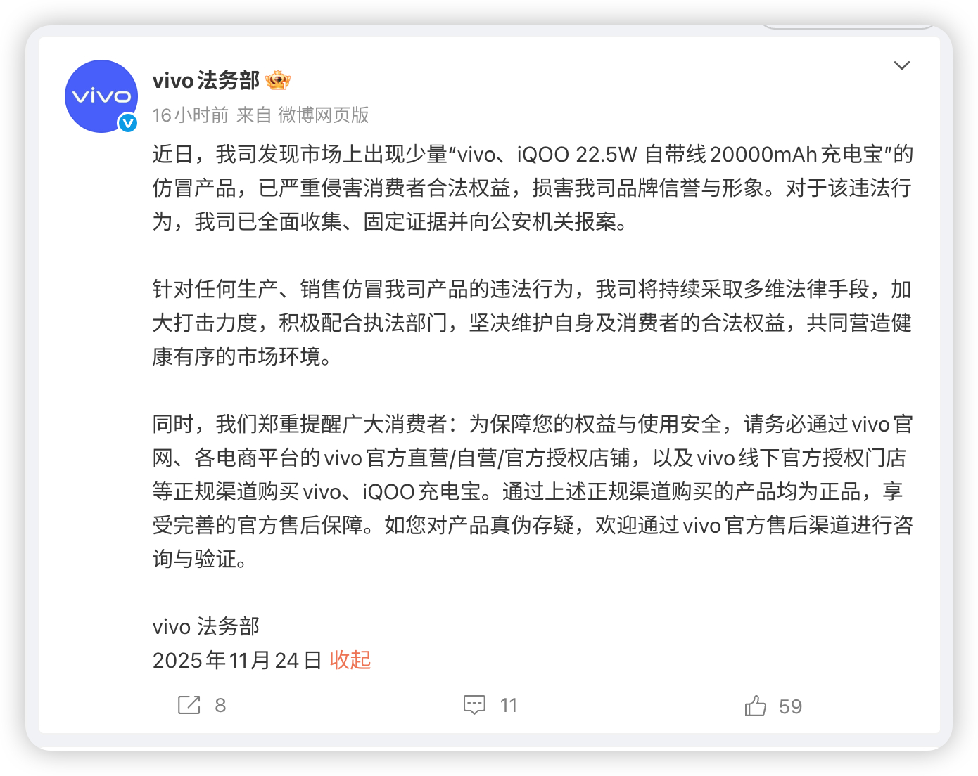 vivo 法务部提醒大伙儿,说市场上出现了少量「vivo 22.5W 自带线20000mAh充电宝」、「iQOO 22.5W 自带线20000mAh充电宝」的山寨仿冒货,大家小心在第三方平台买到歪货,最好认准各个平台的官方旗舰店剁手。我给大家找了下配图,就是 图2 图3 这款。