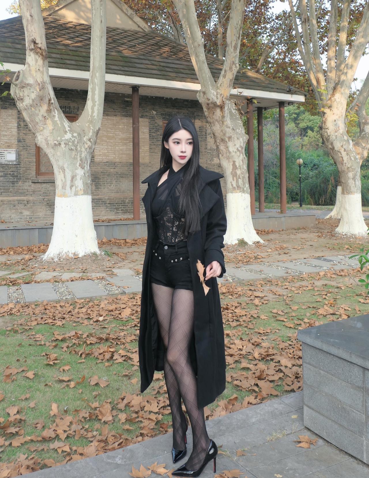秋日漫步,黑衣女子与落叶共舞和闺蜜一起逛街,怎么穿比较好看? 职场女性如何穿着显高