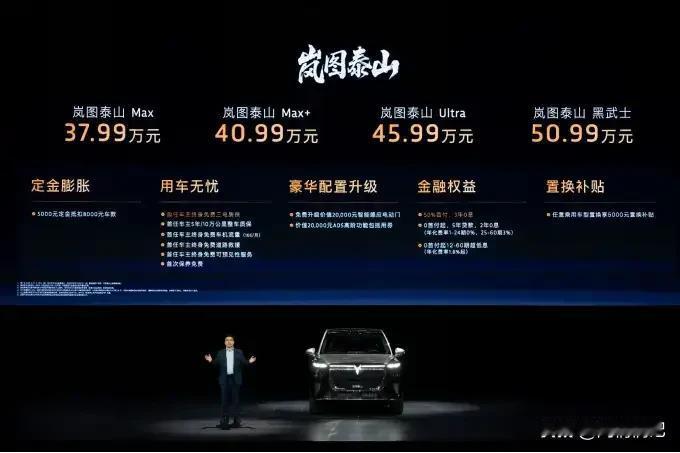 听我一句劝,SUV这样买: 60万——问界M9。 50万——理想L9。 40万——岚图泰山。 30万——途昂Pro。 20万——比亚迪宋。 最近去试驾了岚图泰山,这车真是把40万级SUV的规矩给改了。先说价格,37.99万起,顶配45.99万,比理想L9便宜一大截,但配置却一点也不含糊。 外观就不说了,5米2的车长,直瀑式格栅配上贯穿灯带,往那一停就是“大哥范儿”。重点是这车把华为智驾和鸿蒙座舱全给你配齐了,顶配四个激光雷达,城市NOA随便开,高速上自动变道跟车,堵车时脚都不用踩。 动力更是没话说,1.5T加双电机,5.2秒破百,纯电续航350公里,综合续航1400公里。关键是充电快,800V平台,5C超充,12分钟从20%充到80%,喝杯咖啡的功夫,电就满了。 坐进车内,第二排零重力座椅带按摩,通风加热全都有,吸顶屏能看电影,32个扬声器的音响放首歌,跟在影院似的。底盘是三腔空气悬架,过减速带跟没感觉似的,后轮还能转向,这么大个车,转弯半径才5.4米,窄路掉头一把过。 最狠的是安全,车身用2200MPa的高强度钢,电池双层保护,9个气囊,各种碰撞测试全过,坐进去安全感爆棚。 说白了,岚图泰山就是冲着“性价比”去的。40万的价格,给了你50万的配置,还带华为全套智能,这谁还买传统豪华啊? 大家觉得这车值不值?40万预算,你会选它还是理想L9?