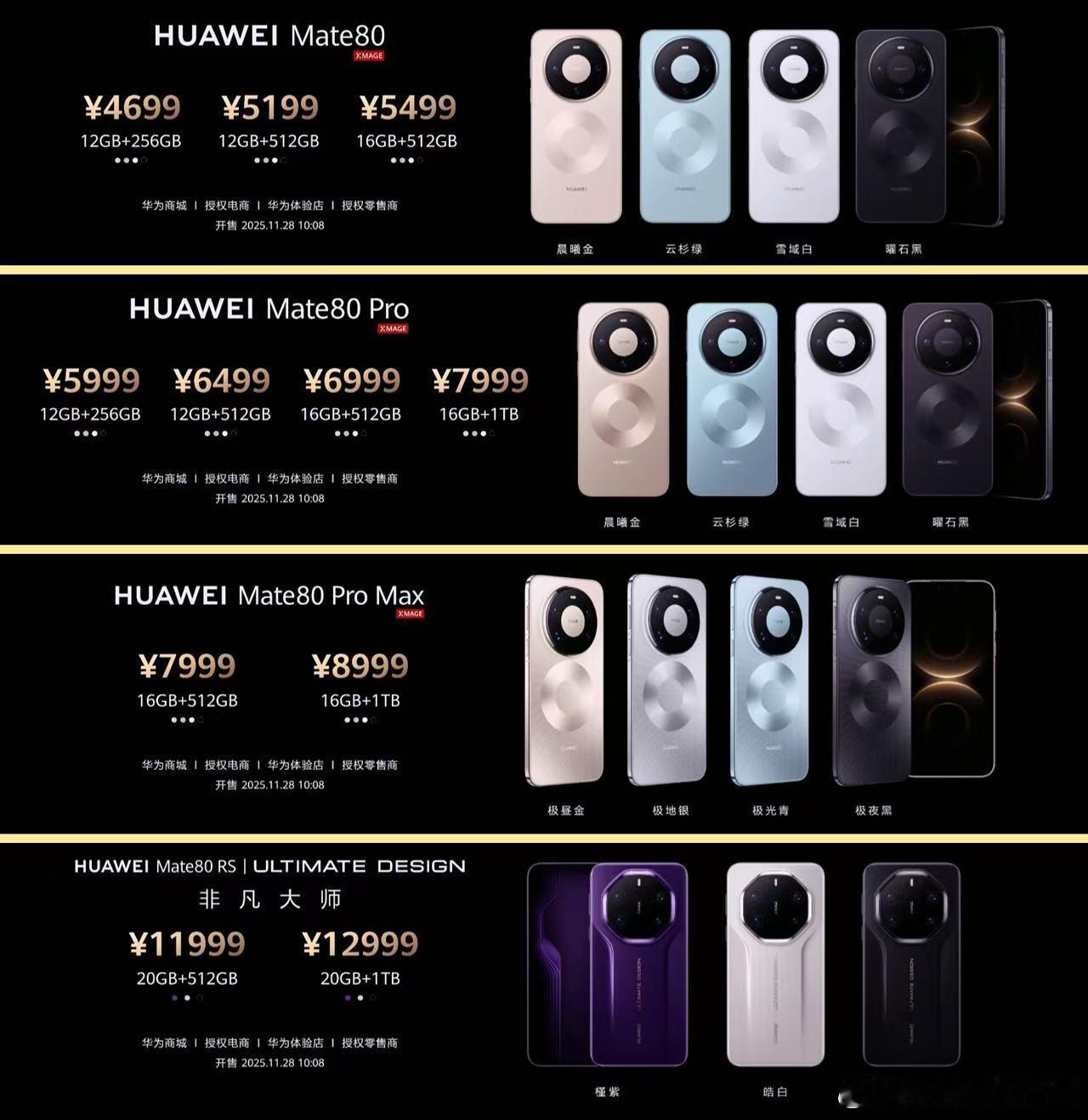 华为Mate80系列售价公布!:•12+256G 4699•12+512G 5199•16+512G 5499华为Mate80 Pro:•12+256G 5999•12+512G 6499•16+512G 6999•16+1TB 7999华为:•16+512G 7999•16+1TB 8999华为Mate80 RS非凡大师:•20+512G 11999•20+1TB 12999