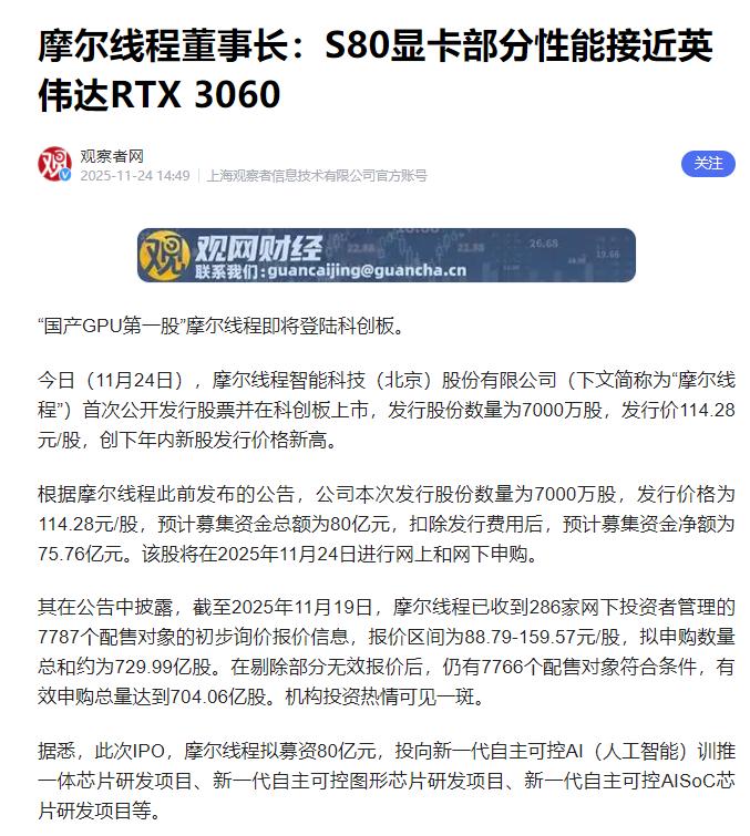 摩尔线程董事长:S80显卡部分性能接近英伟达RTX 3060。但11月21日投资者交流会上,他坦承生态适配仍有短板,同款3A大作帧率不及竞品,而11月24日公司冲刺科创板,704亿股机构疯抢、114.28元/股创年内新高的背后,正是国产GPU性能突围与生态攻坚的激烈碰撞,这背后的破局逻辑远比参数对标更值得深究。 国产算力自主从来不是单靠一款产品撑起来的,摩尔线程冲刺科创板的背后,藏着不少之前没细聊的硬实力,而 MTT S80 显卡在核心性能上能追近国际主流水平,只是其中一个缩影。 先说说技术根基有多扎实。截至 2025 年中,这家成立才五年的公司已经攒下 514 项授权专利,从 GPU 架构设计到 AI 应用、驱动软件,关键领域都有自己的技术壁垒。 更难得的是,它是国内极少数能支持从 FP8 到 FP64 全计算精度的厂商,不管是 AI 训练还是科学计算,都能适配不同场景的需求,这可不是简单堆算力就能做到的。 而且基于自研的 MUSA 架构,单芯片能同时搞定 AI 加速、图形渲染、视频编解码这些事儿,这种全功能特性在国产 GPU 里并不多见,也为后续拓展场景打下了基础。 这次科创板 IPO 能吸引超 700 亿股的有效申购,除了市场看好 GPU 赛道,这种 “国家队 + 产业资本” 的双重背书,也是机构愿意重仓的核心原因之一。 现在大家总说国产替代,摩尔线程已经在工业领域落地了不少实在项目。 和雪浪云合作搞的工业大模型一体机,能帮工厂智能解析 CAD 图纸、生成装配工艺,甚至给盾构机、挖掘机装上天玑算力模组,让这些重型装备从 “干活的工具” 变成能自主决策的 “智能设备”。 这些应用不是实验室里的演示,而是真真切切能帮制造业提效的解决方案,也说明国产 GPU 已经从 “能用上” 向 “很好用” 迈进。 供应链方面,它也提前做了准备。通过和国内芯片制造、封装测试企业合作,搭建了全国产化的供应体系,2024 年底存货就比上年翻了一倍多,就是为了应对市场需求增长和供应链的不确定性。 在当前全球科技竞争的背景下,这种自主可控的供应链能力,比单纯的性能参数更能体现企业的抗风险实力。 当然,张建中也没回避差距,坦言和国际巨头还有要追赶的地方,但这种踏实做事的态度,加上实打实的技术积累和场景落地,反而让人觉得国产 GPU 的崛起不是空谈。 摩尔线程的上市,本质上是国产算力产业链成熟的一个信号,它不再是单点突破,而是在技术、资本、应用、供应链上形成了协同发力。 说到底,S80 显卡的性能突破只是一个起点,国产 GPU 真正的底气,在于像这样能沉下心构建技术壁垒、扎根实体经济场景、搭建自主可控生态的企业。 当越来越多的国产 GPU 能在工业、科研、政务等关键领域站稳脚跟,我们的数字经济才算有了真正安全可靠的算力底座,这比任何单一产品的性能对标都更有意义。