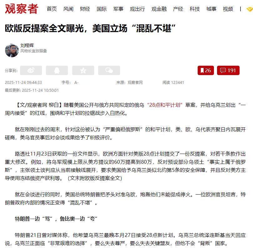 为什么俄罗斯宁愿信美国也不给欧盟好脸色?看看欧盟做的那些事就知道了。2022 年冲突爆发后火速推出 15 轮制裁,冻结俄 2200 亿美元资产;2024 年 6 月敲定长期军援,累计援乌超 596 亿欧元,如今 11 月欧版反提案刚曝光,满是俄无法接受的修改。反观美国虽内部表态自相矛盾,却始终留着谈判余地,这般对比下,俄的选择也就不难理解了! 现在俄乌和平谈判的热闹劲儿,光看表面根本摸不透,欧洲刚甩出反提案,美国那边表态还没捋顺,俄罗斯直接就给欧版方案判了“死刑”,再加上战场上火力一点没减,这哪是谈和平,更像各方在借着文本博弈较劲。 最直接的硬茬来自俄罗斯。克里姆林宫官方直接给欧版反提案定了调,说它“完全没有建设性,对俄罗斯根本不合适”,这话可不是随便放风,是普京的外交助理乌沙科夫公开说的,等于把欧洲的修改意见直接打了回去。 更关键的是,俄方嘴上说谈,手里的动作没停,赫尔松地区照样遭密集炮击,苏梅的居民区也被打击,平民伤亡的消息不断传来,这明摆着是“以打促谈”,用战场压力逼对手让步。 在俄罗斯看来,欧洲把乌军规模提到80万,还删了“乌克兰永不入约”的条款,这根本不符合他们要的“去军事化”“中立化”,相当于核心诉求全没满足,自然懒得跟你磨文本。 欧洲这边抛出反提案,可不是单纯跟美国对着干,背后藏着实实在在的利益盘算。欧盟早就联合德国、法国这些国家搞了个“乌克兰重建计划”,专门拨了3700多万欧元,要帮乌克兰搞基建、建透明的管理机制,还拉上了立陶宛、丹麦一起出钱出力。 说白了,欧洲已经砸了真金白银,肯定不能让美国随便拍板,把乌克兰的领土、安全保障这些关键事定下来,最后自己来收拾烂摊子。 他们改条款也都是冲着实际利益来的:提高乌军规模,是怕乌克兰太弱,以后冲突再爆发,难民、能源危机又得欧洲扛。 要求美国给类似北约第5条的保障,是想把美国绑死在乌克兰问题上,不让它半路抽身;反对美国主导冻结的俄资产,也是怕重建资金被美国把控,自己的投入打了水漂。 再看美国那乱糟糟的样子,根本不是简单的“表态矛盾”,而是连外交流程都乱了套。 之前美版28点计划说是美俄私下起草的,结果特朗普自己都是“最后一刻才知道”,国务卿鲁比奥一开始都被排除在谈判之外,完全绕过了正常的外交渠道。 这边陆军部长德里斯科尔跟乌方谈完还说“挺乐观”,白宫却放话,特朗普对俄乌双方都“越来越失望”,觉得他们不真心想和平。 鲁比奥刚说最后期限可以商量,特朗普又在社交媒体甩锅,一会儿骂乌克兰不懂感恩,一会儿说欧洲买俄石油,这种内部信息都不通畅的操作,难怪欧洲官员都吐槽他们“混乱不堪”。 说到底,特朗普是想在大选前赶紧搞出个“外交成果”,至于欧洲的利益、乌克兰的底线,都得给这个目标让路,可急功近利之下,连自家的表态都圆不上了。 其实现在的核心问题早就不是条款改几个字、军力上限提多少,而是各方对“和平”的理解根本不在一个频道。 俄罗斯想要的是能把占领土合法化、让乌克兰彻底失去对抗能力的“投降书”,欧洲想要的是不埋隐患、能稳住区域局势的“停战协定”,美国则想靠快速达成协议捞政治资本,乌克兰夹在中间只能硬守主权红线。 欧盟砸钱搞重建,本意是为了战后稳定,可现在战场还在打,文本谈判又陷入僵局,这些投入能不能落地都成了未知数。 说到底,和平从来不是靠纸上改条款就能实现的。俄罗斯要是真想买单,就该停了对居民区的打击。 美国要是真为了止战,就该先理顺自己的立场,别光想着政治投机;欧洲的反提案再好,没有俄方的认可也只是废纸一张。 如果各方只盯着自己的利益,一边谈一边打,就算把28点改成18点、8点,也只是换汤不换药。 真要实现和平,得先停下炮火,尊重每个国家的主权和底线,而不是把谈判桌当成博弈的工具,把老百姓的安危当成筹码。