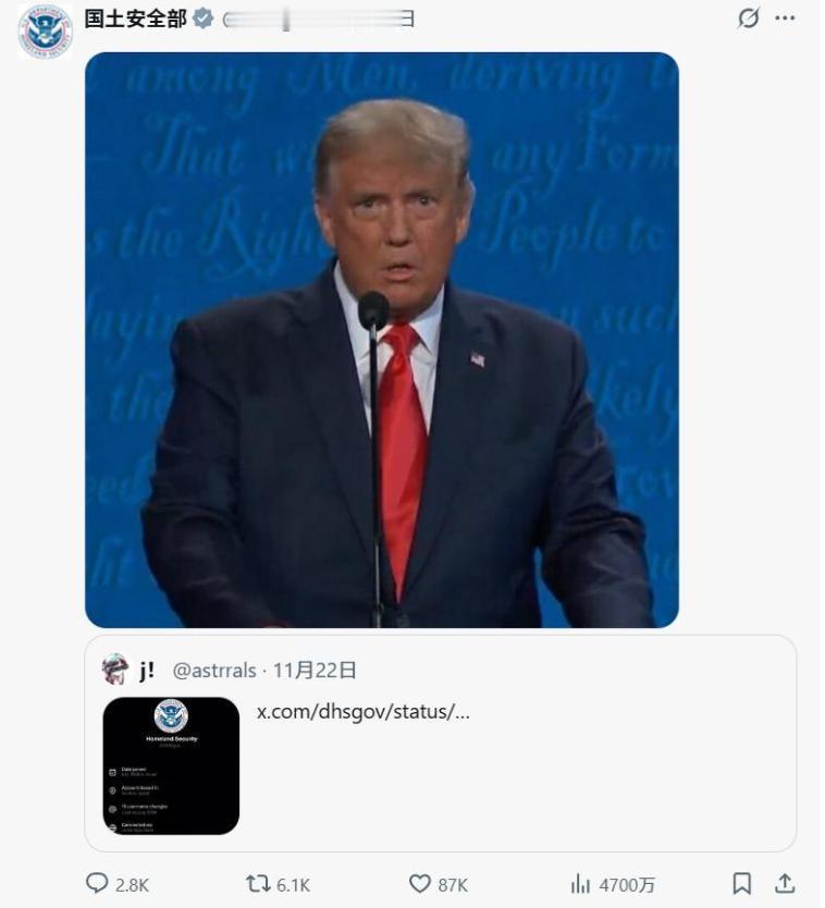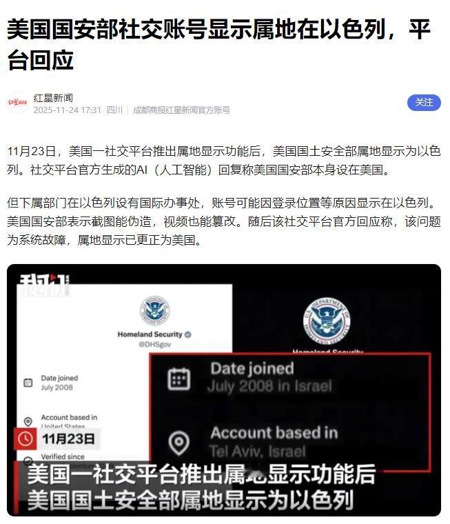 据媒体11月24日报道:社交平台X新功能爆出大瓜,美国国土安全部账号的IP地址居然在以色列! X平台那IP属地功能真是戏比剧还多,兜兜转转下架又上线,这次总算把美国国土安全部的账号标回了“美国”,可越看越不对劲,其他美国政府账号全藏起了位置信息,只敢露创建日期和验证日期,唯独它挂着灰标显示所在地,这波“特殊对待”简直是“此地无银三百两”,说没撒谎谁信? 这事儿根本不是“IP显示错了”那么简单。美国联邦政府早有规矩,国务院《外交事务手册》明确官方账号要单独创建、层层审批,登录信息得备案留痕。 ACF更是要求账号由专门部门统一管理,登录记录随时可查。一个管国家安全的核心部门,账号登录地点这么敏感,要么是没按规定备案,要么是海外登录没走审批,一句“显示错了”根本糊弄不过去,分明是违规被抓包,只能靠撒谎圆场。 更可疑的是国土安全部和以色列的深度合作。双方早有安全项目联手,就算下属ICE在以色列有办事处,也不能成为官方账号异地登录的理由。 按规定,官方账号发布内容得严格审核,海外登录怎么保证合规安全?说不定这账号本就和合作项目挂钩,在以色列运营,曝光后才紧急改回美国IP,还嘴硬说截图是伪造的。 那些MAGA相关账号的乱象更印证了不对劲。之前马其顿、孟加拉国的账号只是冰山一角,后来又扒出印度、菲律宾的账号打着“爱国”旗号带节奏。 美以合作里就有舆情监测技术研发,这些海外账号说不定就是合作产物,专门操控美国舆论,X平台和国土安全部不可能一无所知,现在的说法就是集体撒谎遮掩。 X平台自身也漏洞百出,默认开启功能还可能泄露城市、邮编,电脑端没法关闭,根本没做好数据安全保障。 当初说“IP段变化导致信息不准”,可平台自己宣传能识别VPN,技术上不该出错,说白了就是戳穿了政府违规操作,才紧急下架修改,帮着圆谎。 国土安全部的回应更是离谱,先甩特朗普表情包打马虎眼,被追着要说法才否认,可网友早保存了录屏打脸。 现在改IP的灰色产业几十块就能搞定,谁知道他们是不是紧急改了IP再上线? 这事儿核心从不是“IP错没错”,而是规则没被遵守,还撒了谎。联邦政府定规矩是为了合规,X平台喊着反水军,结果一个违规撒谎,一个帮忙遮掩。网络信任靠的是规则执行,不是改IP、下架功能、说瞎话。 就算IP改回美国,其他账号藏起位置,大家的疑问也消不了,规矩成了摆设,公信力早晚耗光,那些看似天衣无缝的谎言,迟早会被戳穿。