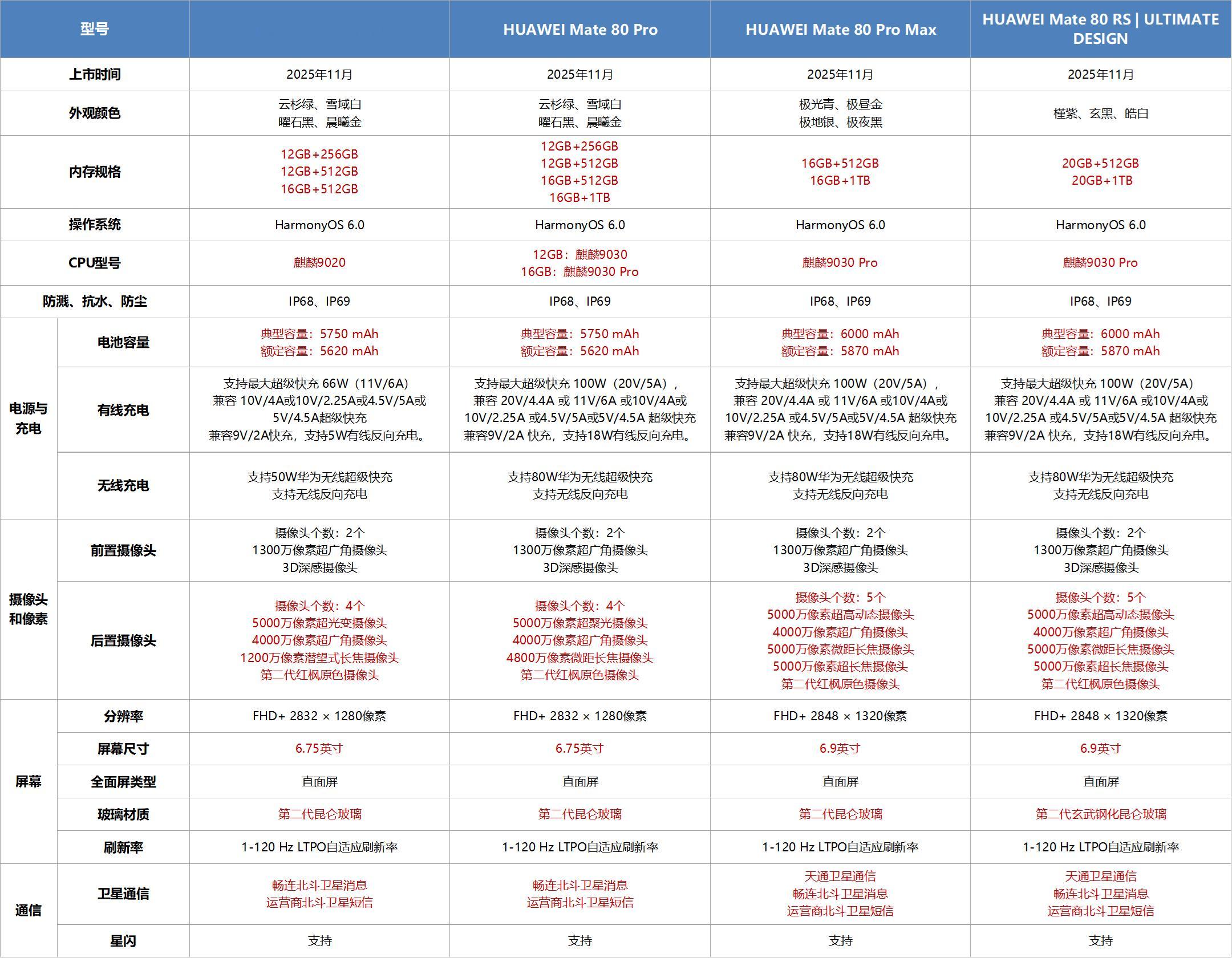 华为Mate80系列详细参数,这代配置价格满意吗?Mate80「麒麟9020」,Mate80 Pro 12GB「麒麟9030」;Mate80 Pro 16GB/Mate80 Pro Max/Mate80 RS「麒麟9030 Pro」