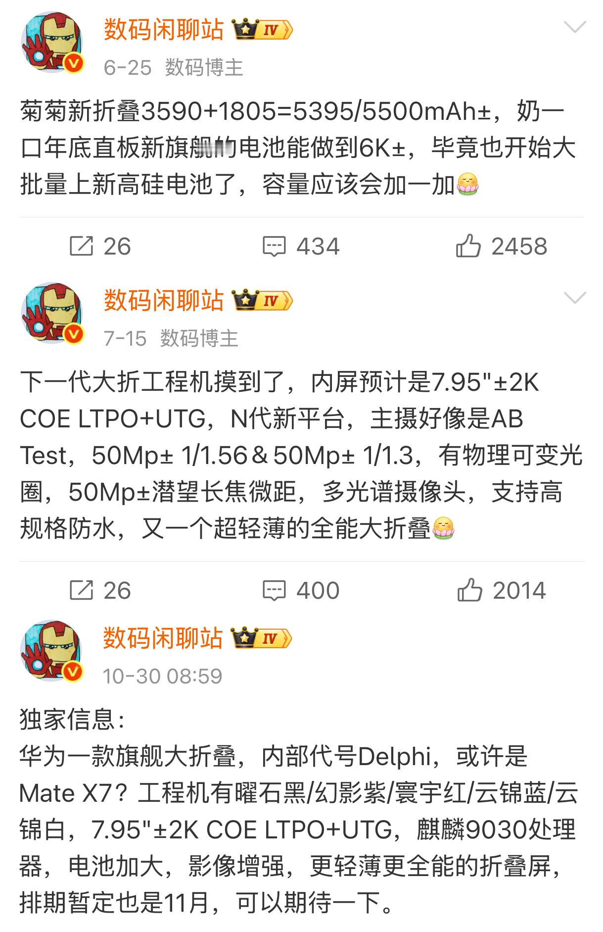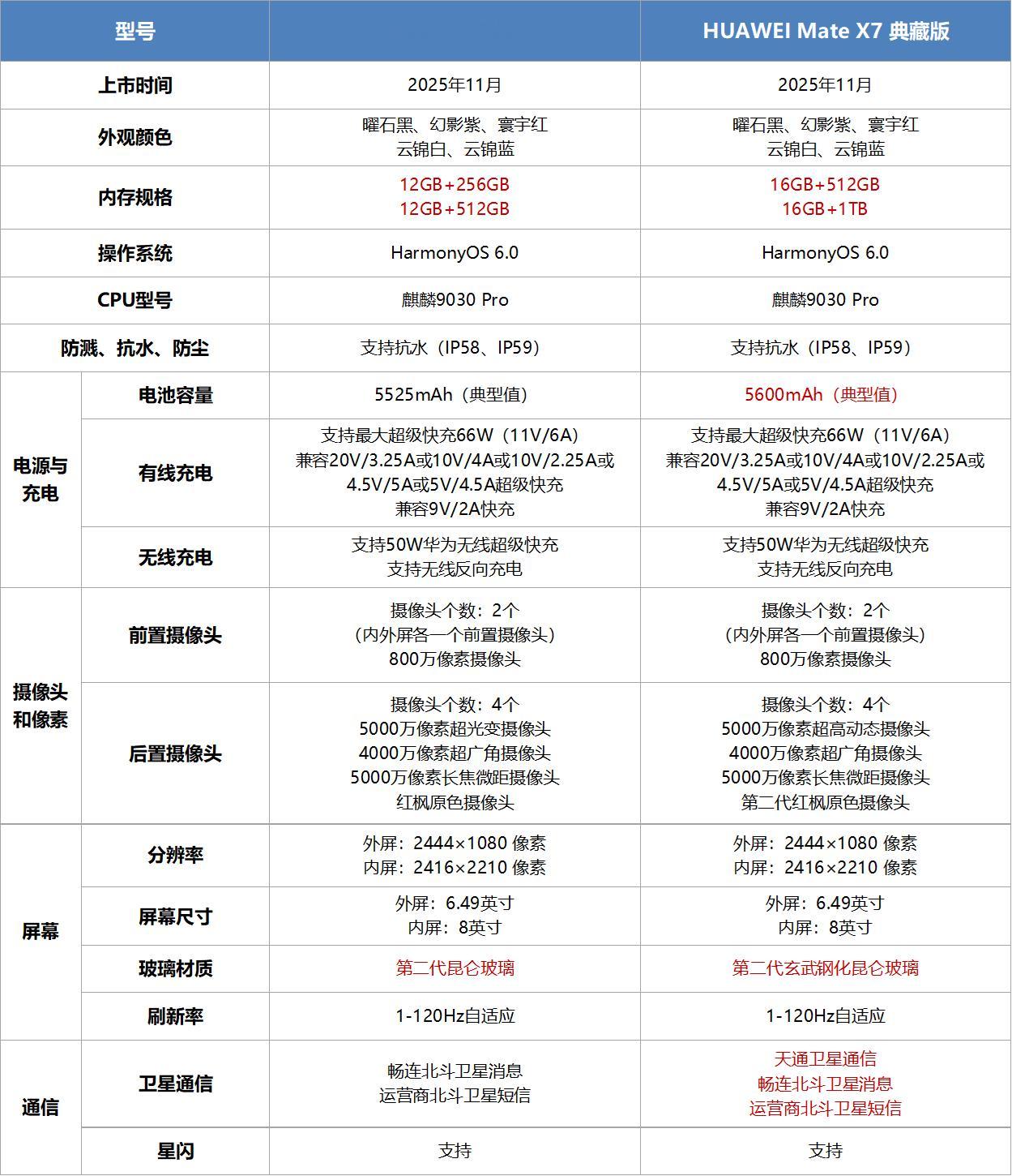 华为Mate X7,这价格可还行?12+256GB——12999元 12+512GB——13999元;16+512GB典藏版——14999元 16+1TB典藏版——15999元;20+1TB手写笔套装17599元内屏COE UTG,麒麟9030 Pro;标准版主摄50Mp 1/1.56" 电池5520mAh,9.5mm/235g;典藏版50Mp 1/1.28" 电池5600mAh,9.5mm/236g