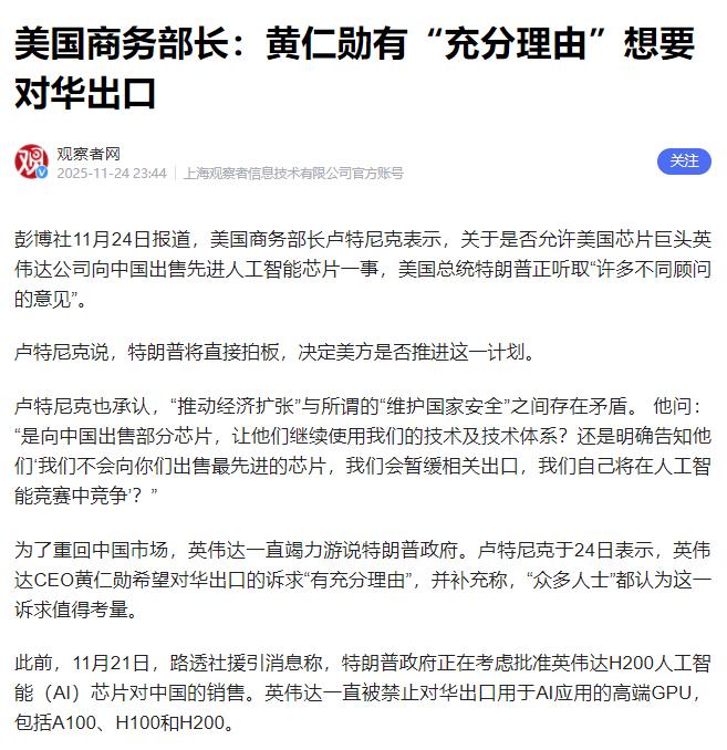 11月24日这声表态简直颠覆认知!曾牵头对华芯片封锁三年的美国商务部长卢特尼克,竟公开力挺黄仁勋,说他想要对华出口芯片的诉求“有充分理由”。2022年起卡死A100、H200出口的铁律尚未松动,如今态度突然反转,而最终拍板权攥在特朗普手里,这场安全与利益的博弈,让中美科技圈的风向瞬间变了。 中国市场对英伟达的吸引力,早就不只是服务器机房里的AI芯片了。 2024年国内新能源汽车市场里,英伟达的Orin-X智驾芯片装机量直接冲到210万颗,比去年涨了快一倍,市场份额稳稳占着39.8%,理想、蔚来这些车企都离不开它。 更让人意外的是,就算是被阉割了八成性能的H20芯片,去年在华销售额也飙到230亿美元,经销商加价30%都抢着要,字节、阿里这些企业宁愿等货也得买。 这背后不是中国企业不想换国产,而是英伟达的CUDA生态太强势,不管是训练AI模型还是适配智驾系统,整套工具链都成熟得很,换芯片意味着要重新折腾,企业根本耗不起。 这种实打实的市场需求,正是黄仁勋敢一直游说的底气,也难怪美国商务部长会说他的诉求“有充分理由”。 再说美国那边,想继续卡脖子也没那么容易了。2024年他们牵头搞了个“瓦森纳减一”框架,本来想联合欧盟、日本抛开俄罗斯,精准管控对华芯片出口,结果内部吵成一团。 欧盟里不少国家怕得罪中国,影响自己的高科技合作,日本也觉得老框架跟不上技术变化,多边共识根本难达成。 更关键的是,瓦森纳协定要42个成员国全同意才能改规则,俄罗斯肯定不会点头,这让美国的封锁计划处处是漏洞。 与此同时,美国半导体产业自己也扛不住了,SIA的报告里提到,持续的出口限制让本土供应链连锁反应,从晶圆制造到封装测试,不少企业订单缩水,相关制造业的就业也受了影响。商务部长心里清楚,再这么硬卡,受损的是美国自己的产业根基。 黄仁勋的“充分理由”,还藏在全球技术竞争的新逻辑里。以前美国觉得封锁能拖慢中国芯片发展,可现在看,就算限制了高端芯片,中国企业在智驾、边缘计算这些领域的需求反而越来越旺,而且这些需求大多是民用场景,根本算不上“危害国家安全”。 更重要的是,英伟达的优势不只是芯片性能,而是整套生态,全球大部分AI软件都基于它的技术体系,就算中国能做出性能接近的芯片,短期内也难替代这套生态带来的效率优势。 对美国来说,与其让这些市场需求倒逼中国加速自主替代,不如有条件放开出口,既赚了真金白银,又能维持技术生态的话语权,这笔账其实很划算。 中方的态度也很务实,虽然对H20芯片的远程控制、数据跟踪等安全风险提了明确要求,还让英伟达提交证明材料,但并没有一刀切禁止。 这说明中国市场不是要关门,而是要在安全合规的前提下开展合作。毕竟,不管是智能驾驶还是AI产业,短期内确实需要高性能芯片来支撑发展,但这并不意味着要依赖进口,而是通过合理引进,为国产芯片争取更多迭代时间。 美国商务部长认可黄仁勋的诉求,本质上是认清了一个现实:技术封锁从来都是双刃剑,全球科技产业链早已深度绑定,你中有我我中有你。 黄仁勋的“充分理由”,既是中国市场的刚性需求给的,也是美国产业的现实压力逼的,更是全球技术合作的大势所趋。 未来的科技竞争,不该是你死我活的封锁,而是在合规框架下的良性比拼。谁能放下零和博弈的执念,谁就能在全球市场里站稳脚跟,这才是芯片贸易背后最该看清的道理。