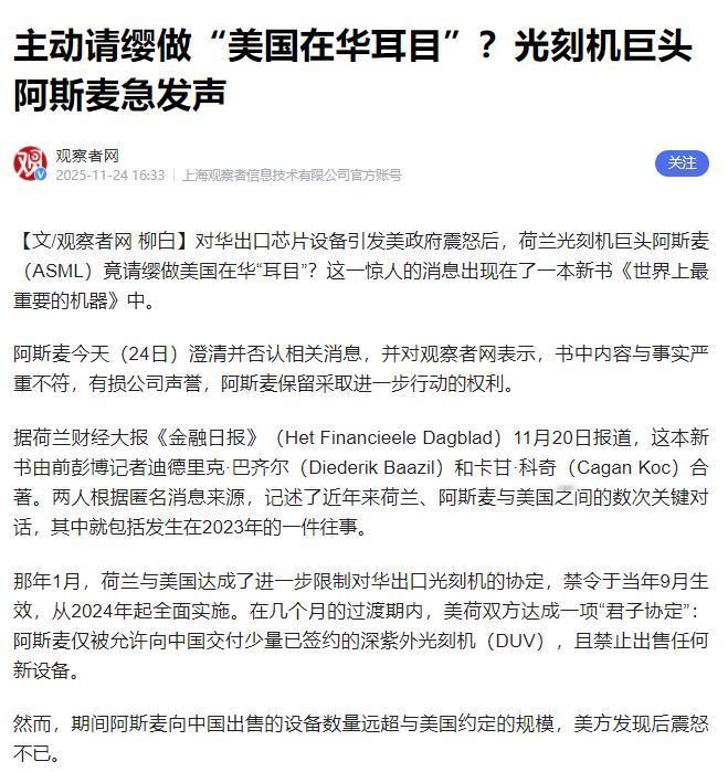 建议彻查荷兰光刻机巨头阿斯麦! 11 月 20 日新书《世界上最重要的机器》抛出阿斯麦愿做美国在华 “耳目” 的猛料,11 月 24 日这家荷兰巨头就火速向观察者网发声,怒批内容严重不实、损害声誉,直言早已警示作者并保留追责权利。匿名爆料的出格说法缺乏实据支撑,企业的坚决否认也未提供第三方佐证,这场罗生门藏着太多疑点,显然不能只听单方之词。 咱们先说说传闻的可信度。这本书由前彭博记者合著,核心依据是匿名消息来源,这种没有公开信源支撑的说法,本身就值得打个问号。 毕竟现在AI工具识别虚假新闻的准确率都能达到99%,匿名爆料的水分向来不小。 但反过来想,阿斯麦的澄清也并非无懈可击,他们只强调“从未提过此类提议”,却没拿出内部会议记录、沟通文件等实质性证据佐证,也没说明是否接受过第三方独立调查。 再看阿斯麦的处境,确实让这事多了层微妙感。最新财报显示,阿斯麦三季度订单额仅为预期的一半,股价暴跌16%创下26年来最大跌幅,中国市场占比也将从之前的近一半骤降至2025年的20%左右。 一边是美国持续施压,荷兰政府2024年就吊销了部分对华设备许可证,2025年还加强了设备维修维护限制。 另一边是业绩承压,中国市场的重要性不言而喻。在这种夹缝中,阿斯麦是否有过“冒险换宽松政策”的想法,虽然没有实据,但也不能完全排除,毕竟企业在生存压力下的决策往往复杂难测。 更关键的是,整个事件缺乏第三方验证。荷兰政府没就传闻表态,美国方面也没回应是否收到过相关提议,新书作者也没公开更多证据支撑匿名爆料。 阿斯麦一直强调自己“合规经营”,但合规体系再完善,也不能完全排除个别高管在特殊压力下有过不当提议的可能,毕竟2023年确实发生过阿斯麦对华设备交付量超美荷“君子协定”的情况,当时还引发美方震怒、荷兰首相追责。 从行业逻辑来看,阿斯麦作为全球唯一能生产极紫外光刻机的企业,靠的是全球供应链的信任协同。 真要是做了“传递情报”这种事,一旦曝光,损失的不只是中国市场,而是全球客户的信任,这对企业来说是致命打击。 但反过来说,美国牵头的出口限制,在阿斯麦CEO看来越来越像“出于经济动机”,在这种地缘政治裹挟下,企业是否会做出反常决策,也很难一概而论。 说到底,目前双方各执一词,都没有足够的铁证说服公众。匿名传闻不可轻信,但企业单方澄清也不能直接当真。 在科技领域博弈日趋激烈的当下,这类敏感传闻更需要中立第三方介入核查,比如荷兰监管机构公开调查结果,或者作者提供更多可验证的线索。 毕竟这事不仅关乎一家企业的声誉,还牵扯到全球半导体产业链的信任基础,马虎不得。 信息时代,不管是爆料还是澄清,都得有实打实的证据支撑,盲目相信任何一方,都可能被带偏节奏。