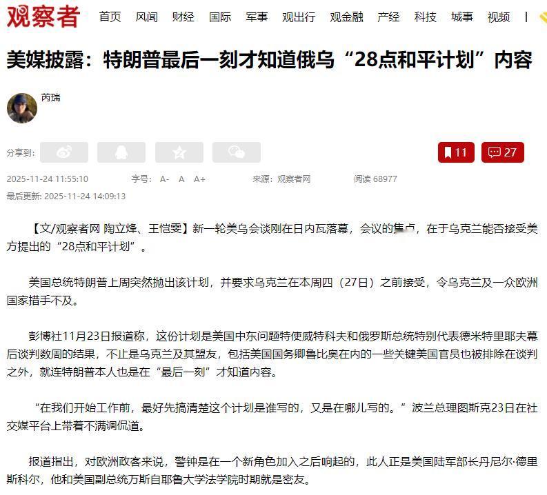 完全没什么可信度!11 月 20 日俄乌 “28 点和平计划” 刚被美媒曝光,特朗普就急着给乌克兰设下 11 月 27 日的接受死线,可美媒紧跟着戳破真相,他所谓 “最后一刻才知情” 根本是装的!一份左右多国命运的和平提案,总统偏要演 “后知后觉” 的戏码,既摆足强硬施压的姿态,又想避开计划争议的锅,这场始于暗箱操作的博弈,从根上就透着诡异的虚伪。 日内瓦会谈刚结束,美国方面就喊着“进展显著”,把28点计划改成了新版框架,可俄欧乌压根不买账,俄方说没收到新文本,只认美俄直接沟通的版本。 欧洲英法德牵头搞了“反提案”,连美国想拿50%乌克兰重建利润的条款都给删了;乌克兰也只敢含糊说“提替代方案”,核心的割地、弃北约条款半个字不敢松口。 这乱象的根子,说白了就是特朗普在演“不知情”的戏码。美媒早披露他“最后一刻才知情”,可白宫官员早就证实,这份计划是特朗普亲自批准的,副总统万斯、他女婿库什纳都全程参与制订,10月迈阿密闭门会谈就是他们一起搭的框架。 这戏演得一点都不高明。你想啊,德里斯科尔一个陆军文职官员,敢绕过国防部长,跑到基辅逼泽连斯基割地,说“特朗普没耐心了”,要是没总统背后撑腰,他有这胆子? 更别说计划里的条款,分阶段解除对俄制裁、邀请俄重返G8,全是特朗普之前公开提过的诉求,怎么可能是“最后一刻才知道”? 他这是摸准了国内情况,爱泼斯坦丑闻闹得沸沸扬扬,共和党内部也有分歧,急着拿个“和平政绩”转移视线,把民众注意力从丑闻拉到国际“成就”上。 俄欧早就看穿了这场戏。普京嘴上说计划“可作为基础”,实则等着美国真能按住乌克兰;俄总统助理乌沙科夫直接否定欧洲方案,只认美俄之前谈的版本,就是吃准了特朗普急着交易的心态。 欧洲更直接,法国外长巴罗直言“和平绝不能是投降”,欧盟不仅把乌军规模上限提到80万,还明确反对美国私吞重建利益。 说白了就是不想为特朗普的政治表演买单,毕竟战火在欧洲门口,难民、能源危机他们扛着,美国却想坐收渔利,换谁都不乐意。 特朗普这场“不知情”的表演,本质是把国际和平当成了国内政治的道具。他不管乌克兰民众会不会为割地愤怒,不管欧洲盟友的安全利益,甚至不管美国自己的外交规则,只想着怎么靠一场“交易式和平”给自己捞好处。 可国际政治不是戏台,俄欧的冷眼、乌克兰的硬撑,都说明没人愿意配合他的演出。 说到底,真正的和平从不需要伪装和演戏,更不能靠牺牲小国主权、算计盟友利益来实现。 特朗普的表演,不仅暴露了他的功利与自私,更给国际社会提了个醒:当大国领导人把和平当成政治筹码,把“不知情”当成甩锅工具,只会撕裂国际信任,埋下更多冲突的种子。这种表演式的和平游戏,终究骗不了任何人,也走不长远。