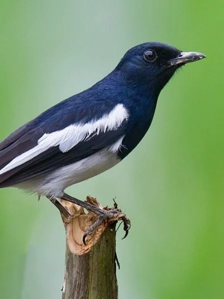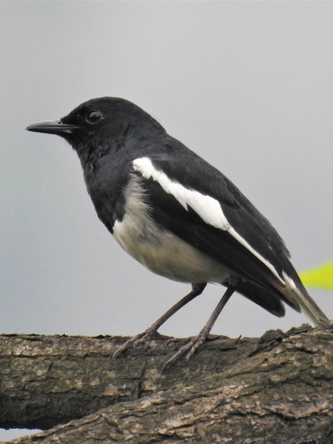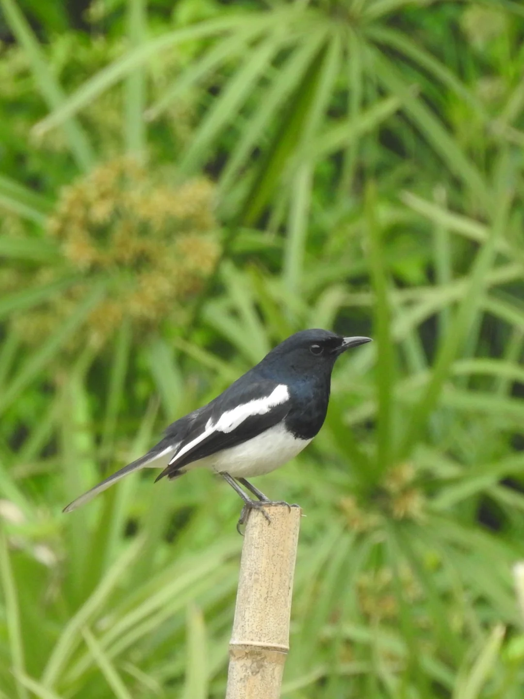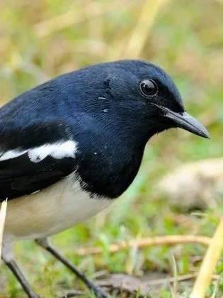 体长约21厘米,长的像迷你版的喜鹊,雄鸟头、胸、背部黑色;翅具白斑;腹部白色。但雌鸟则以灰色或褐色替代雄鸟的黑色部分。