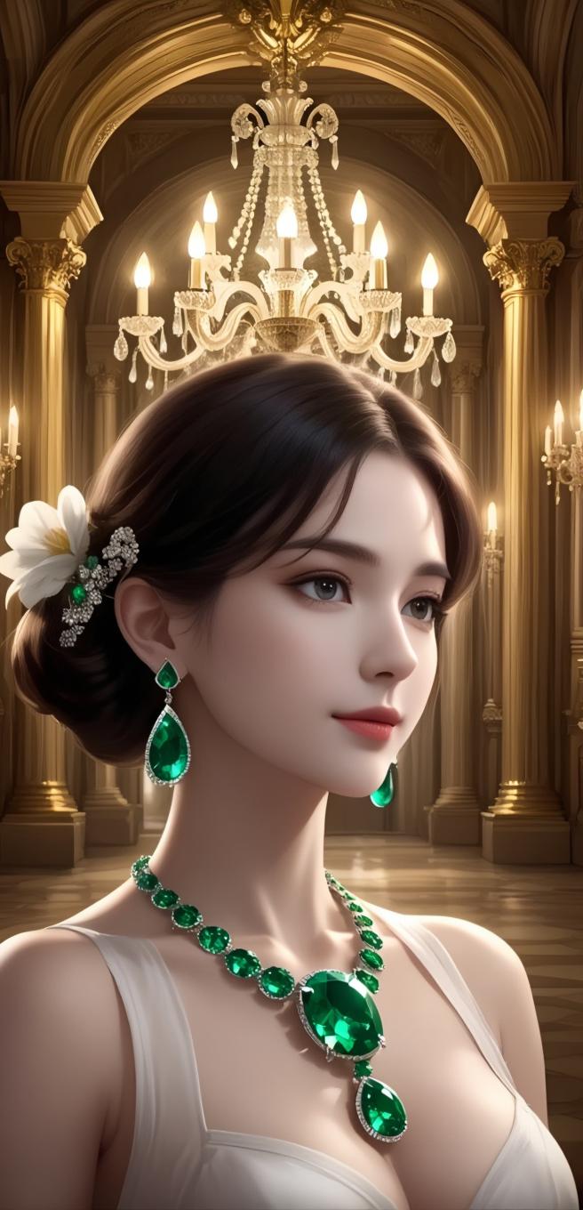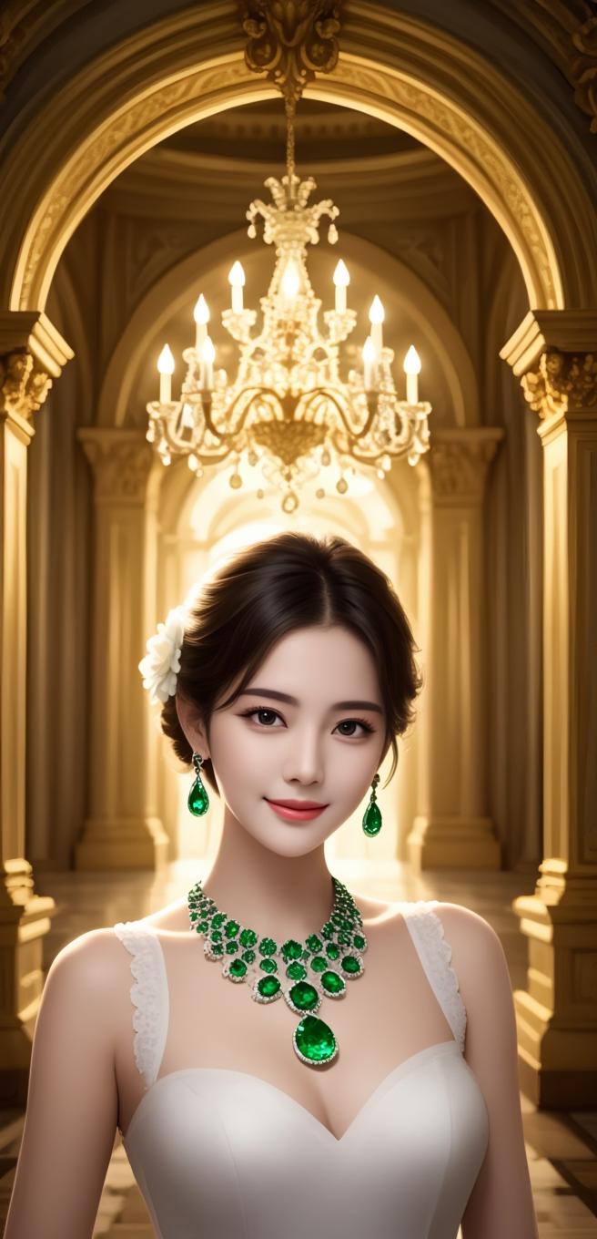 豪华走廊,水晶吊灯和绿宝石。