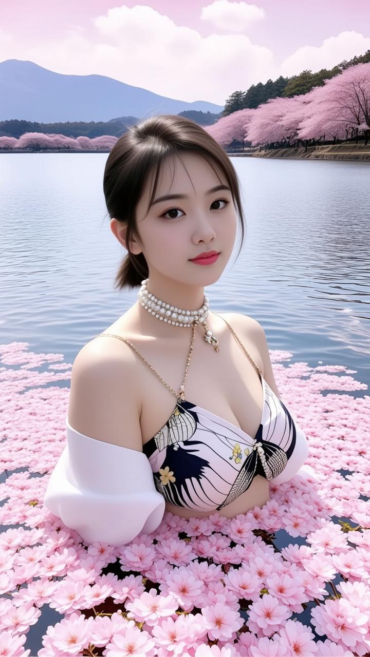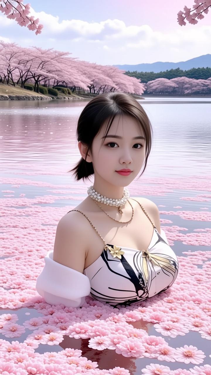 樱花盛开,少女如画,湖畔漫步,春意盎然。