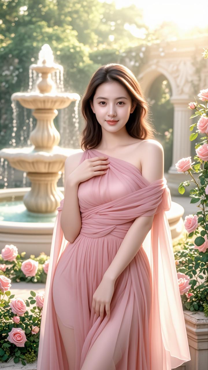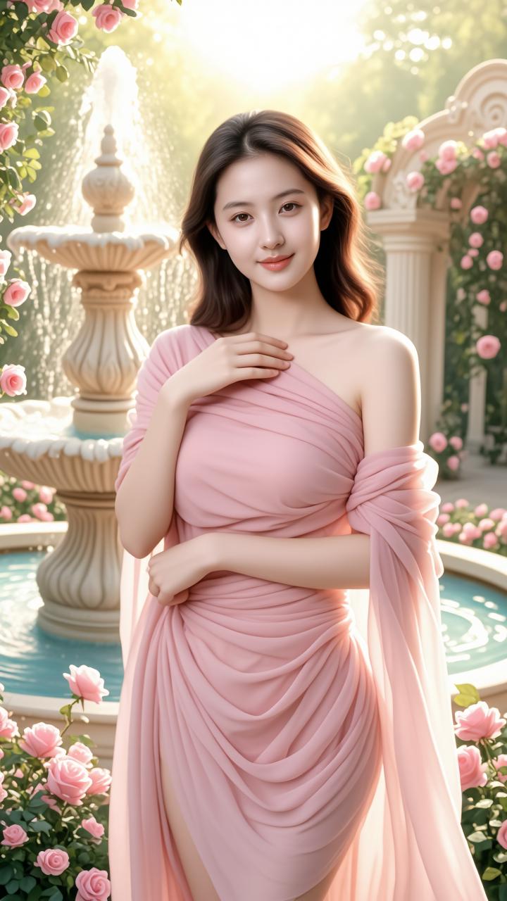粉嫩少女在浪漫花园中,与喷泉和玫瑰相伴,尽显优雅与甜美。