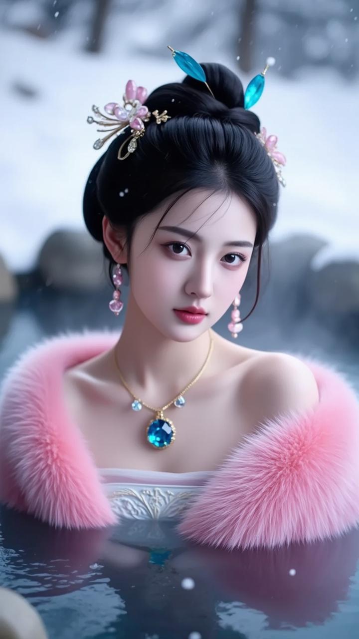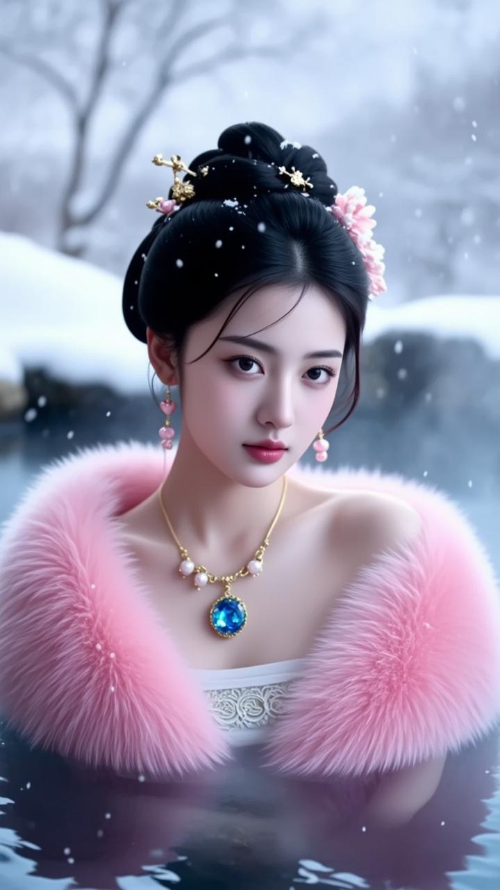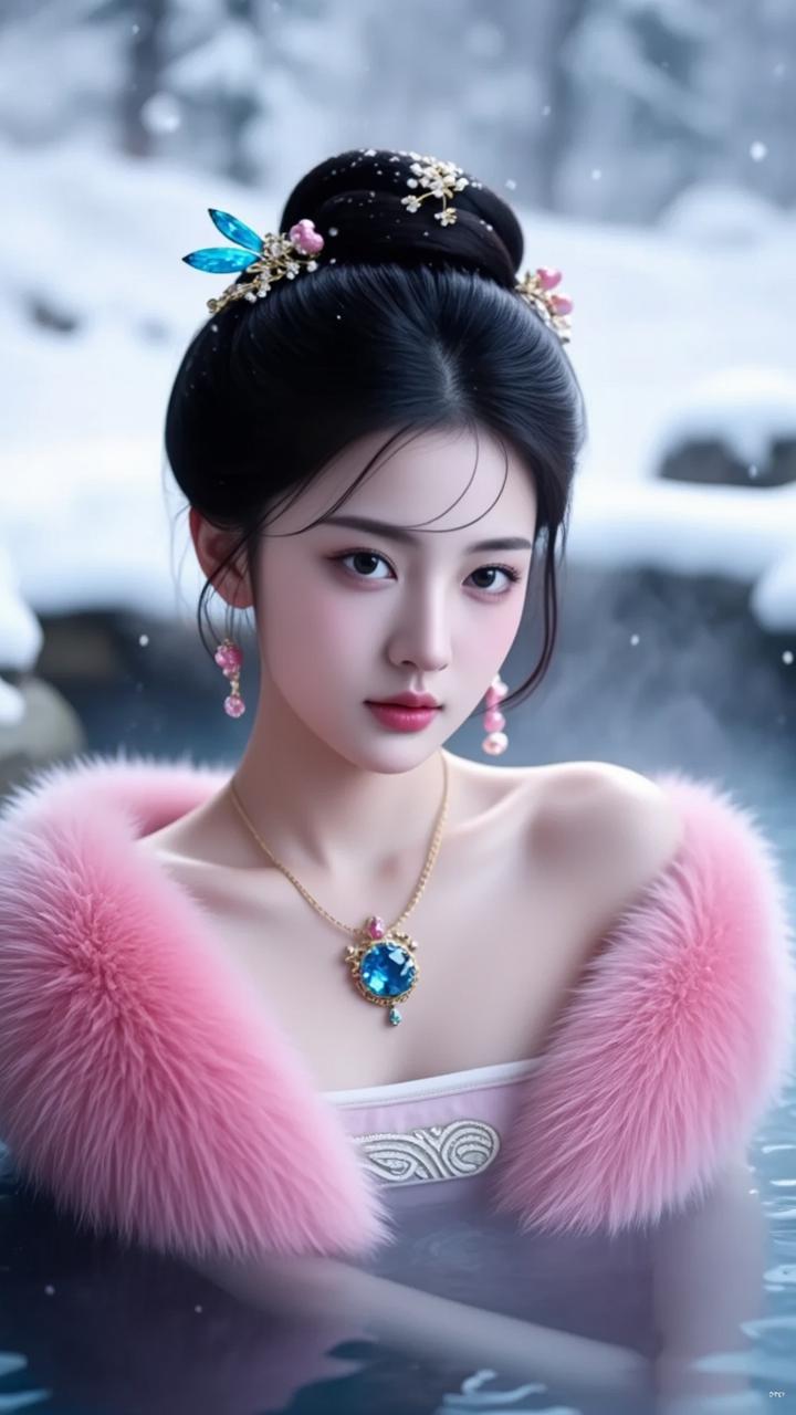 冬日雪景中的美人,粉色的毛绒外套与雪景相映成趣,宛如童话中的公主。