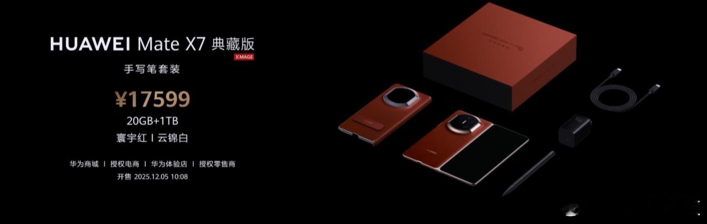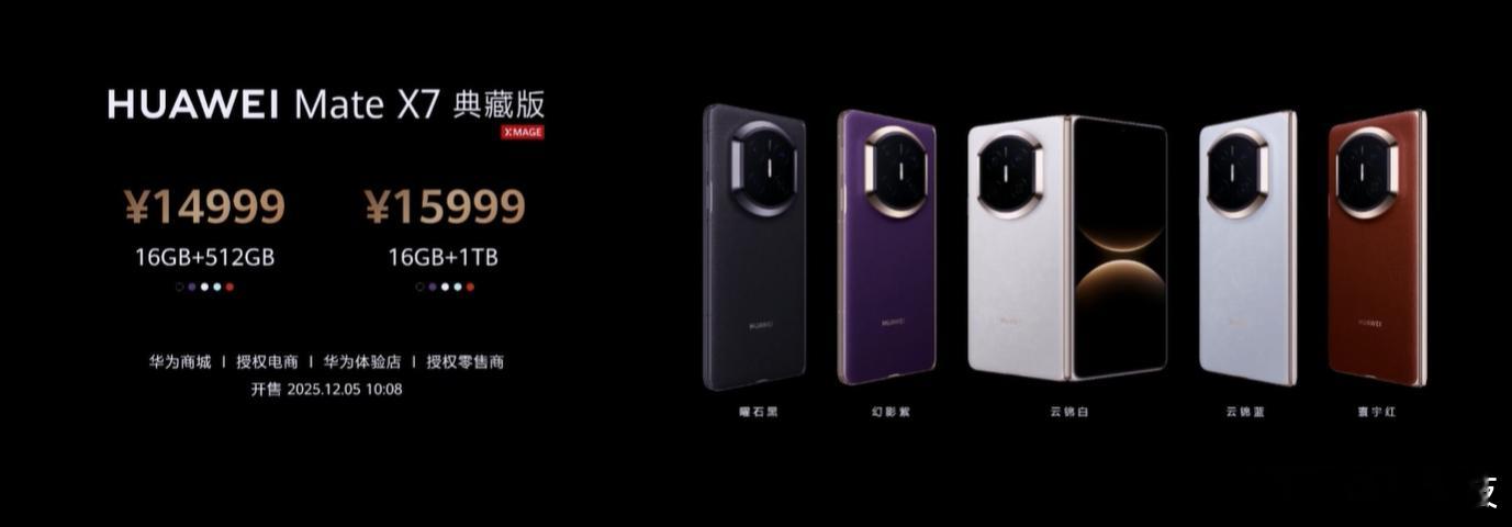 的价格来了,12999元起,典藏版14999元起。Mate X7还有一个典藏版手写笔套装,20GB+1TB版本17599元