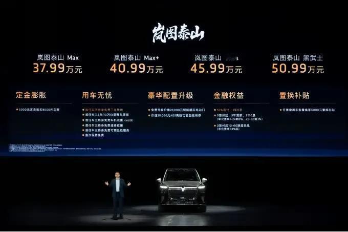 不管你信不信,反正我信了! 1、三年不换车,买韩系 2、六年不换车,买美系 3、八年不换车,买日系 4、十年不换车,买德系 5、终生不换车,买国产 近日,岚图汽车携旗舰车型泰山登场,新车定位为插混大型SUV,将于11月18日正式上市,上市21分钟大定订单突破1万台 。 车内采用6座布局,搭载华为乾崑ADS 4、鸿蒙座舱5、岚海智能超混、三腔空气悬架和后轮转向等技术,让这台5.2米级全尺寸六座SUV,既打破了豪华配置的价格壁垒,又重构了人车交互的核心逻辑。 先看外观,岚图泰山超大尺寸直瀑式格栅的车头,与LOGO形成视觉呼应,被网友誉为“岚图版库里南”,格栅上方贯穿车头的纤细LED日行灯,与下方分体式大灯形成明暗对比,灯组内置DLP智慧投影功能,解锁时投射的专属迎宾图案,让每次上车都充满仪式感。大六座旗舰看岚图泰山 官方指导价为37.99万元-50.99万元。同时,还公布了价值48000元的上市首销期限时权益,以及包括专属交付礼遇、积分增值回馈、购置税无忧保障在内的尊享计划。 同时,4颗激光雷达巧妙隐藏于格栅边缘与前保险杠两侧,既为高阶智驾辅助提供了全方位感知硬件支撑,又避免了突兀的科技堆砌,侧面轮廓采用方正设计,保证了车内头部空间,半隐藏式星河元素门把手解锁时自动弹出,配合电动侧踏与迎宾展翼光毯,在乘客靠近时自动激活,既降低了风阻,又极大提升了上下车便利性,尤其适配老人与儿童。 车身尺寸 5230/2025/1817mm,轴距 3120mm,智能驾驶:搭载华为乾崑智驾ADS 4,采用四激光雷达方案(1颗高精度+3颗DTOF近程雷达),配备34个传感器,支持300米探测、特殊车辆识别及交警手势响应。 智能座舱:首搭鸿蒙座舱5,集成语音AI大模型 。 续航与充电:标配65kWh电池,CLTC纯电续航350km,综合续航1400km+;支持800V+5C超充,12分钟充电20%-80% 。 底盘技术:同级唯一标配三腔空气悬架与EDC魔毯底盘,提供百万级驾乘质感。