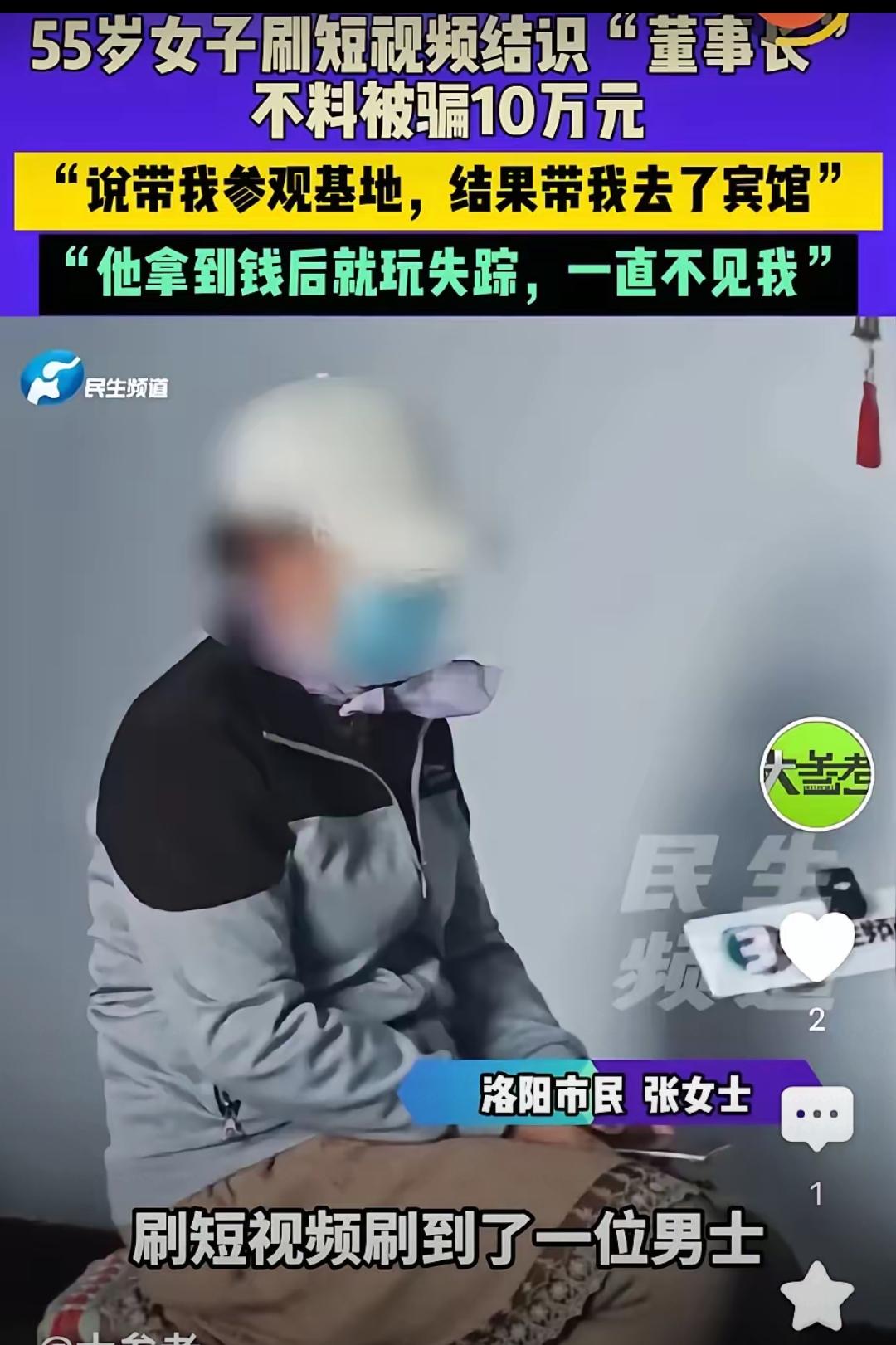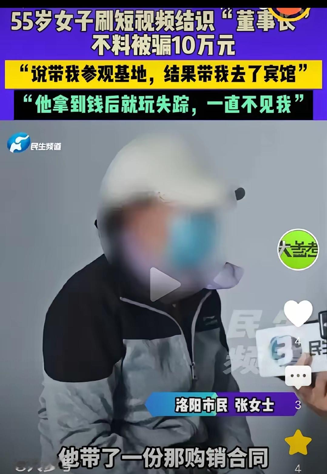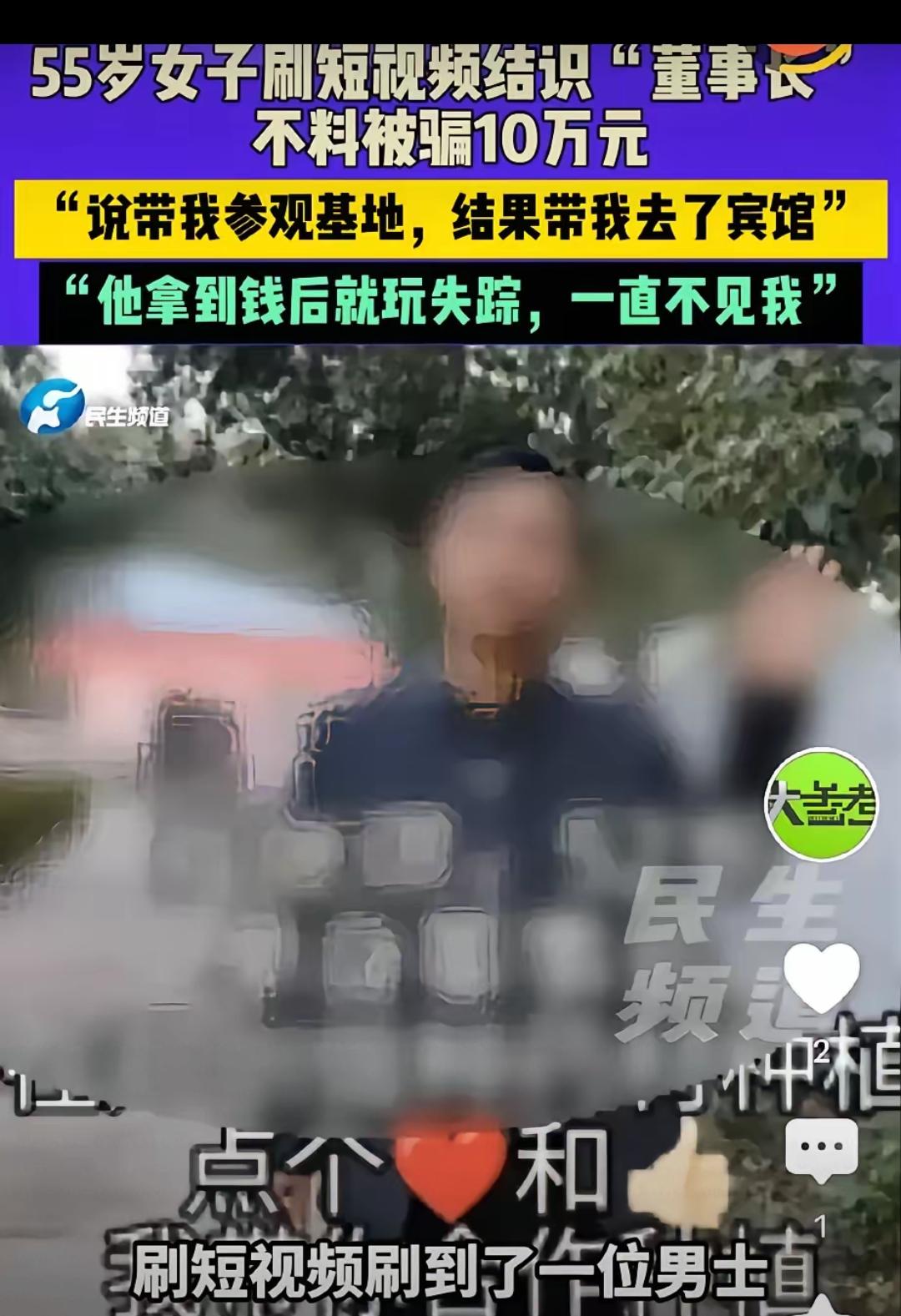 警惕!短视频里的"完美爱情",可能是榨干你的骗局 现在的骗子真是无孔不入!专挑中老年人的情感软肋下手,用甜言蜜语裹着刀子,太让人不齿了! 55岁的张女士刷短视频认识个"公司董事长",对方穿名牌、说情话,把自己包装得完美无缺。几句"我喜欢你"就让张女士动了心,不仅发520红包、拿300块给对方买衣服,还被所谓的"项目周转"骗走10万多,钱一到账,这位"董事长"直接失联。 其实骗子的套路很简单:用虚假身份营造好感,再用情感绑架套取信任,最后以各种名义骗钱。很多人被骗,不是因为傻,而是源于对情感陪伴的渴望和对美好生活的向往,可这份真诚偏偏成了骗子利用的工具。 记住,天上不会掉馅饼,更不会掉完美恋人。面对陌生人的过分热情和金钱请求,一定要多留个心眼。你身边有人遇到过类似的骗局吗?