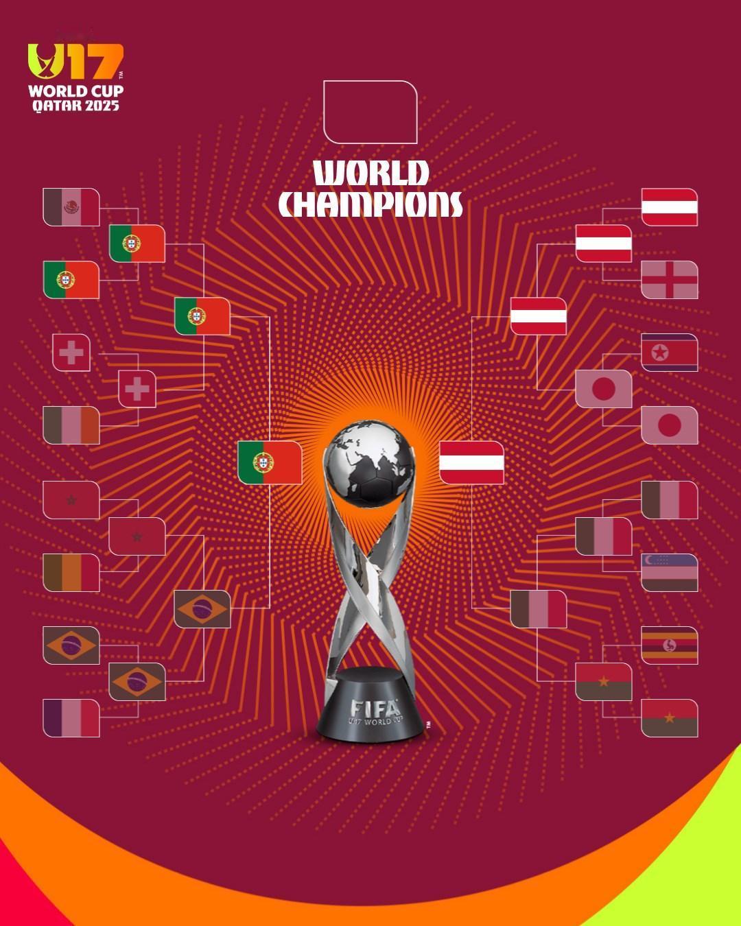 葡萄牙U17队与巴西队0-0战平后进入点球大战,凭借内托的神勇发挥,以6-5险胜,首次晋级U17世界杯决赛。奥地利队则凭借莫泽的两粒进球,以2-0战胜意大利队,历史性地首次闯入各年龄组别的决赛。莫泽在本届赛事中已攻入八球。这两支欧洲劲旅将于11月27日在卡塔尔哈利法国际体育场展开对决,双方都渴望捧起队史首冠奖杯,队中涌现出众多冉冉升起的新星。