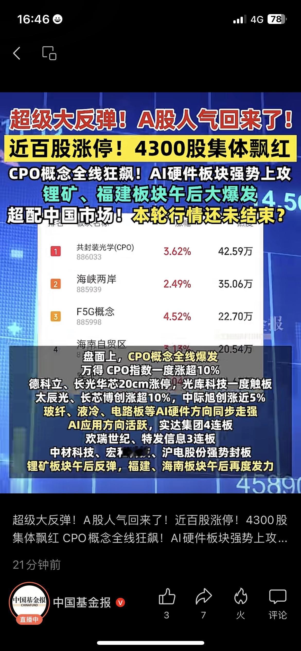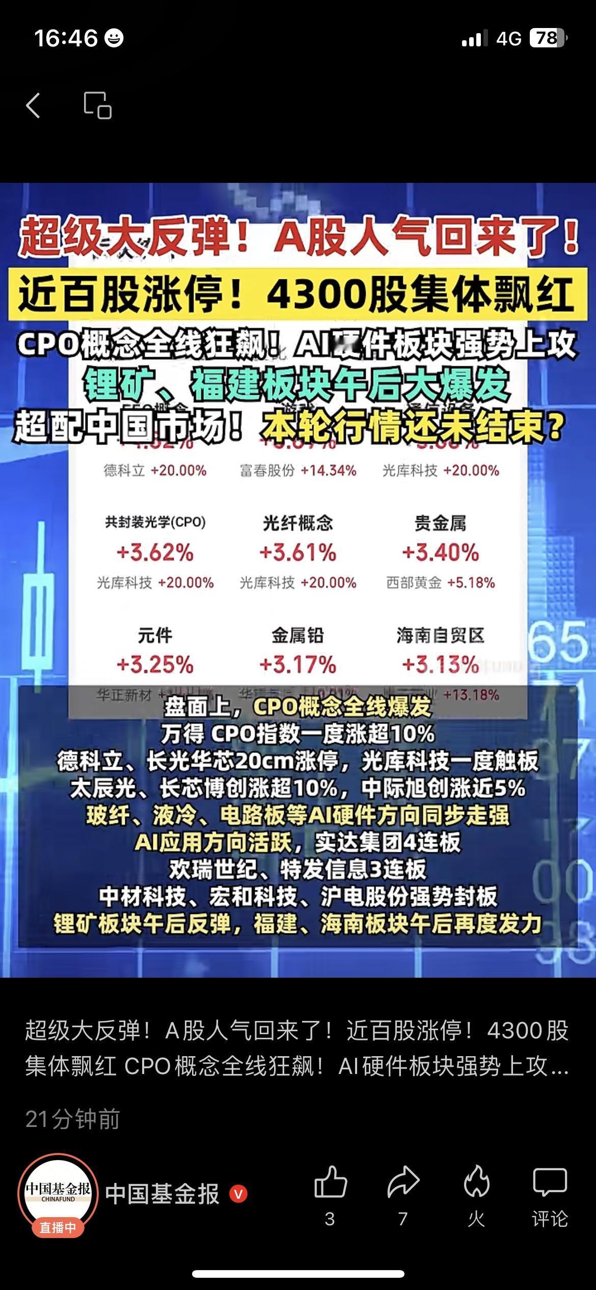 A股疯涨!近百股涨停,4300股飘红,这波能抄底吗? 今天打开股票软件直接看傻了!A股突然大反弹,近百只股票直线封板,4300多只全飘红,CPO、AI硬件板块涨得飞起,好多股民晒出盈利截图,连亏了大半年的朋友都喊“终于解套了”! 身边新手都在问:是不是牛市要来了?现在能跟风入场吗?其实老股民都懂,市场反弹≠趋势反转,CPO这类热门赛道波动大,别盲目追高。但不得不说,这波行情确实给市场提了气,至少不用再对着绿盘叹气了。 你今天赚了多少?是趁机止盈还是加仓了?觉得这波反弹能持续多久?评论区聊聊~ A股大反弹 股市热点 投资理财