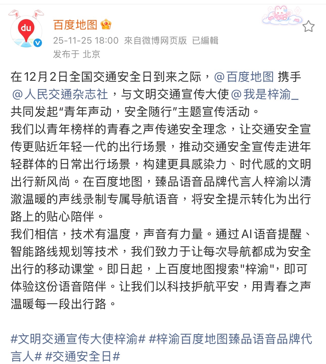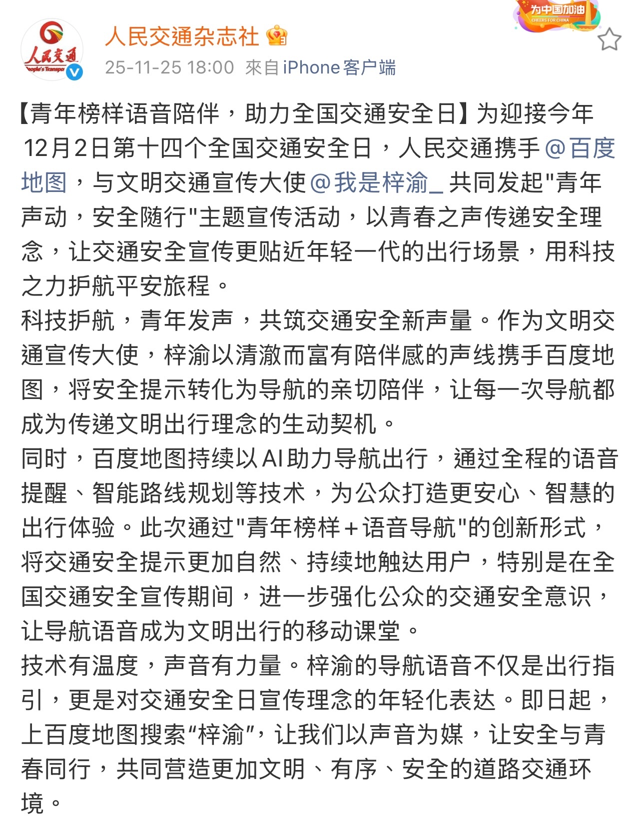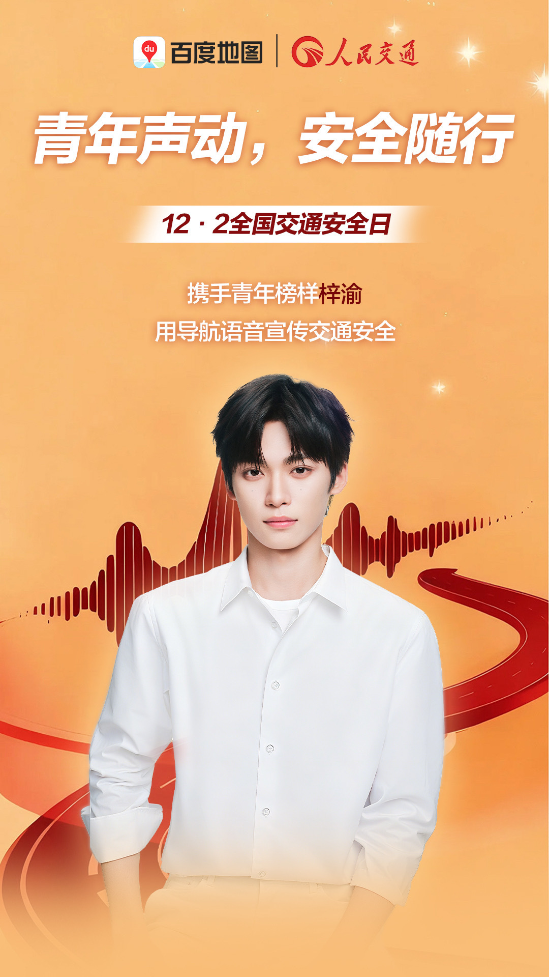 12月2日是全国交通安全日,人民交通携手百度地图,与文明交通宣传大使梓渝共同发起“青年声动,安全随行”主题安全活动,青年榜样梓渝以青春之声传递安全理念,这就是正能量艺人的正向影响!