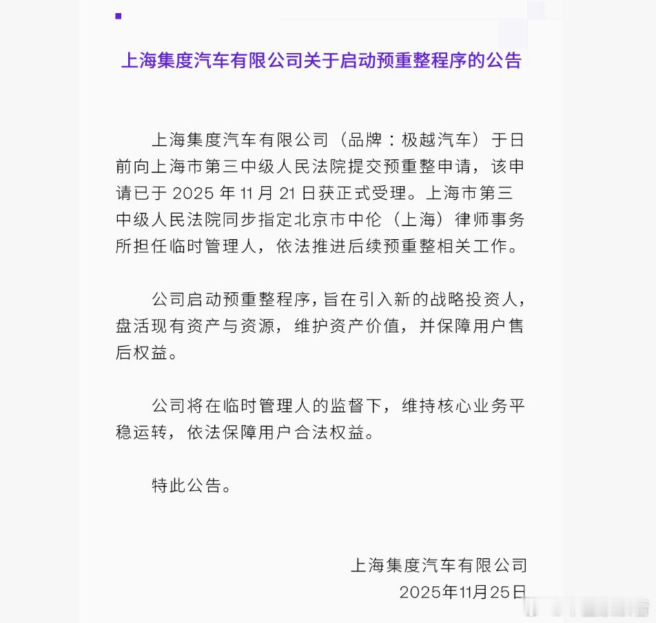 还能穿上“复活甲”吗?极越汽车拟引入新投资方近日,有消息称极越汽车关联公司上海集度汽车有限公司新增一则破产审查案件,引发外界关注。随后,11月25日,极越官方公众号发布了关于“启动预重整程序”的公告。官方表示,上海集度汽车有限公司(品牌:极越汽车)于日前向上海市第三中级人民法院提交预重整申请,该申请已于2025年11月21日获正式受理。公司启动预重整程序,旨在引入新的战略投资人,盘活现有资产与资源,维护资产价值,并保障用户售后权益。资料显示,上海集度汽车有限公司成立于2021年11月,法定代表人兼CEO为夏一平。截至目前,该公司被2次列入失信被执行人,涉案总金额近47万元。该公司有25条被执行人信息,被执行总金额高达约1.3亿元。此外,公司还有3条限制消费令的信息,其中两条涉及到法人夏一平。据此前报道,2024年12月,夏一平在一场全体员工大会上承认公司正面临困难,需立即调整,并宣布公司进入“创业2.0阶段”。有数据显示,2024年全年,极越新车交付量为13561辆。 (原创/欢欢)
