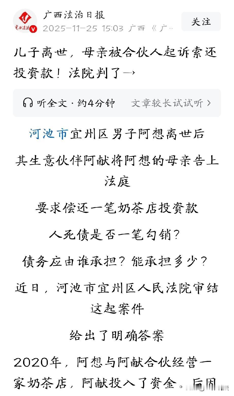 “人死债消?”广西河池,男子和朋友合伙开了一家奶茶店,后来经营不善,奶茶店倒闭,朋友多次找男子催要投资款。男子认可他至少欠20000元投资款,但只偿还了5000元,就不幸意外离世。男子去世后,朋友不依不饶,把男子的母亲告上法庭,索要56000元投资款和法律咨询费。男子母亲表示,奶茶店倒闭后,并没有进行清算,无法认定是否存在欠款,而且朋友没有证明男子留有遗产,凭什么还?法院审理后,最终这样判。 听到朋友阿想意外离世的消息,阿献心里咯噔一下,他没想到,阿想走的这么突然。 他和朋友阿想合伙开的奶茶店早已倒闭,可一笔投资款还没结清,如今阿想意外离世,这笔钱难道就打了水漂? 思来想去,阿献不得不把阿想的母亲告上了法庭,索要5.6万余元款项。 事情要从2020年说起,阿想和阿献怀揣着创业梦,合伙开了一家奶茶店。 阿献爽快地投入了资金,本以为能靠着小生意赚点钱,没想到现实远比想象残酷。 由于经营不善,奶茶店没开多久就撑不下去了,匆匆关门歇业。店铺虽然关了,两人之间的账目却一直没来得及清算,这也为后来的纠纷埋下了隐患。 时间一晃到了2022年,阿献开始频繁通过微信联系阿想,催要自己当初投入的投资款。 起初两人沟通还算平和,在一次聊天中,阿想明确认可自己至少还欠阿献2万元。 2023年,阿想通过微信转账给阿献还了5000元,可剩下的钱却迟迟没有动静,阿献多次催促,阿想都以各种理由推脱,这事就这么拖了下来。 让人没想到的是,2024年7月,阿想不幸病逝。 这个消息让阿献既意外又焦虑,他知道阿想生前没有配偶和子女,父亲也早已过世,唯一的亲人就是年迈的母亲。 钱还没还完,人就没了,这可怎么办?阿献心里犯起了嘀咕,思前想后,他还是决定用法律武器维护自己,的合法权益。 阿献要求阿想的母亲偿还剩余的投资款5.6万余元,以及法律咨询费。 接到法院传票后,阿想的母亲又悲痛又气愤。 法庭上,阿想的母亲直击要害:他们俩是合伙做生意,奶茶店倒闭后根本没清算,到底有没有欠款、欠多少都没法确定! 她还强调,阿献连阿想留有遗产的证据都拿不出来,凭什么让她还钱?更何况那笔法律咨询费,更是毫无依据。 法庭上,双方各执一词,争论不休。 法官仔细查看了阿献提交的微信聊天记录,阿想生前已经自认至少欠款2万元,并且偿还了5000元,这就意味着双方之间1.5万元的债务关系是明确成立的。 依据《最高人民法院关于民事诉讼证据的若干规定》第三条规定,一方当事人在诉讼过程中向法庭承认对方当事人陈述的案件事实,另一方当事人无需举证证明。 聊天记录显示阿想明确认可“至少尚欠2万元”,该表述属于当事人对自身债务的自认。 阿想的自认具有法律效力,能够直接证明双方之间存在1.5万元的债权债务关系,无需阿献再提供其他额外证据佐证。 即便阿想母亲以“未清算”为由抗辩,但阿想的自认已明确了债务金额,足以排除清算程序对本次债务认定的阻碍。 至于阿献主张的其余款项和法律咨询费,由于缺乏足够的证据支撑,法院没有予以认可。 案件的争议在于,这1.5万元债务是否需要阿想的母亲来偿还呢? 《民法典》第一千一百六十一条规定,继承人以所得遗产实际价值为限清偿被继承人依法应当缴纳的税款和债务。 超过遗产实际价值部分,继承人自愿偿还的不在此限。继承人放弃继承的,对被继承人依法应当缴纳的税款和债务可以不负清偿责任。 阿想离世后,其母亲作为唯一第一顺序法定继承人,未明确表示放弃继承,应在继承遗产的实际价值范围内承担清偿责任。 最终,法院作出判决:阿想的母亲以继承阿想遗产的实际价值为限,向阿献清偿债务1.5万元;驳回阿献的其他诉讼请求。 人死未必债消,债务并不会随着债务人的离世而凭空消失,而是会在遗产继承的范围内得到清偿。