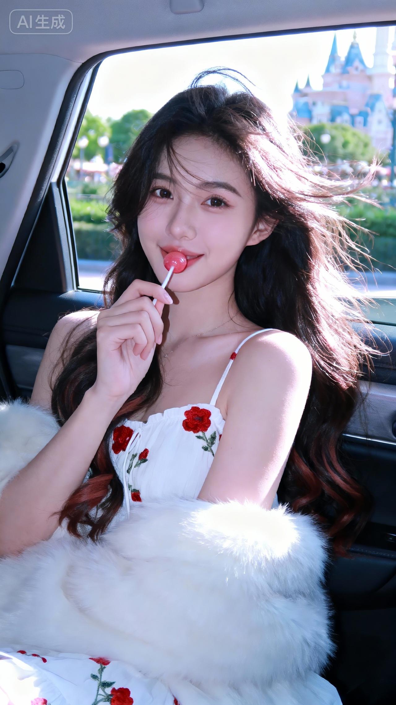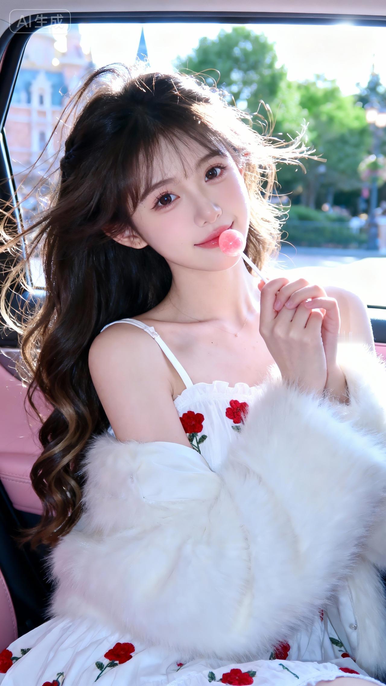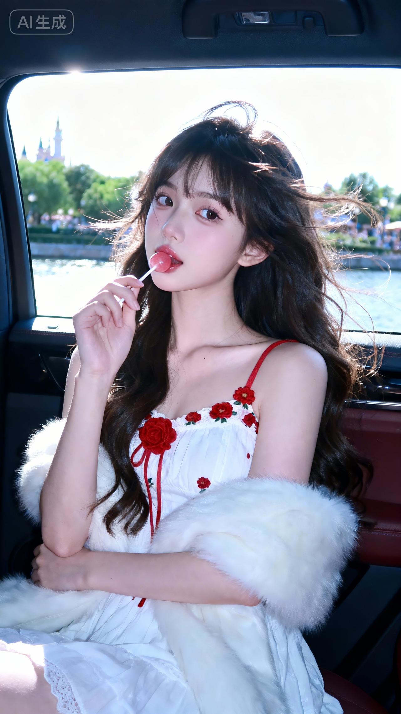 车内甜美,白裙红玫瑰刺绣配毛绒外套,甜欲少女氛围感拉满温柔内饰 米色内饰 汽车显白穿搭