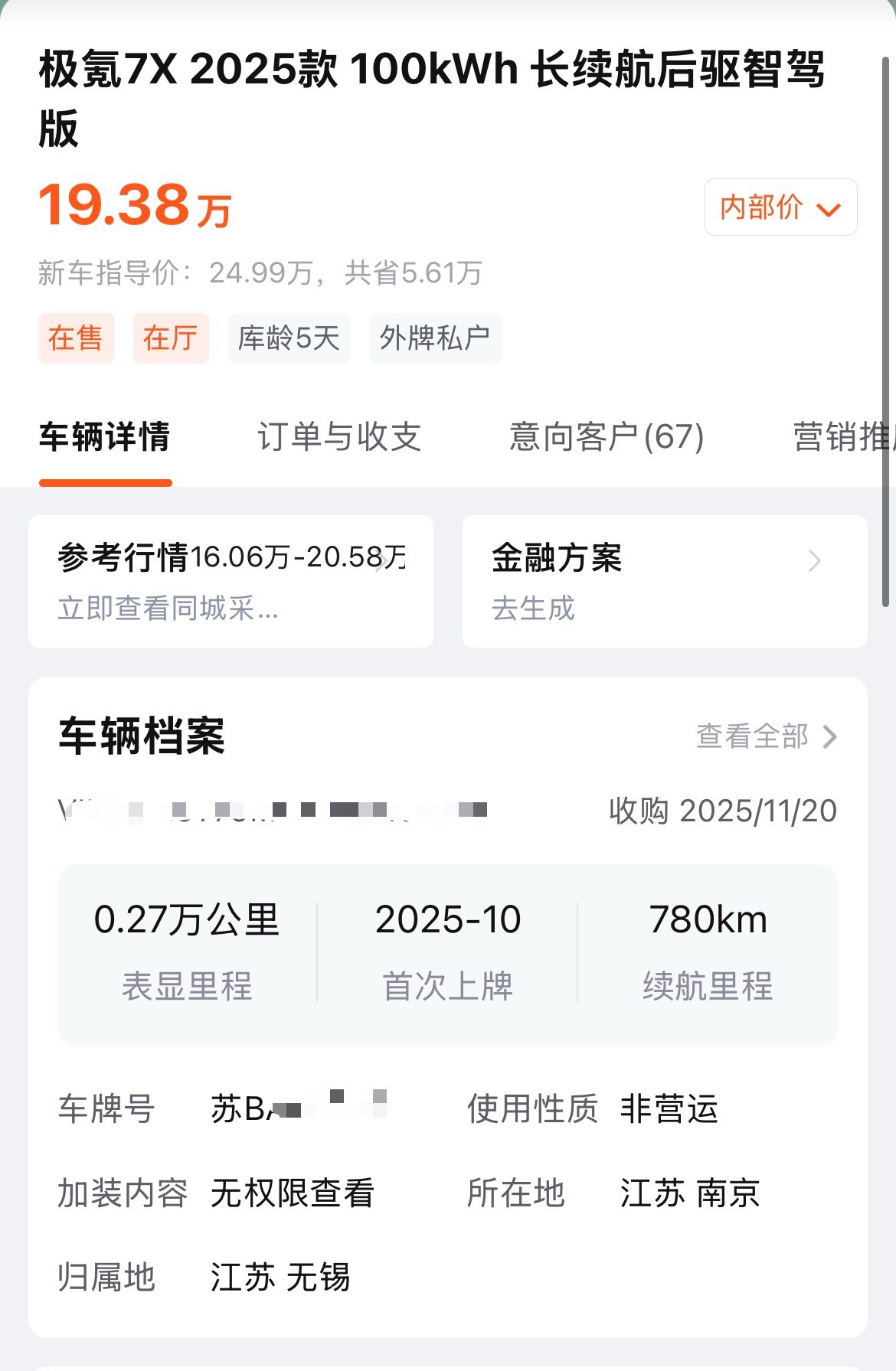 25款极氪7X,10月份上牌,2700公里,一口价19.38万,这种准新二手车最好卖。