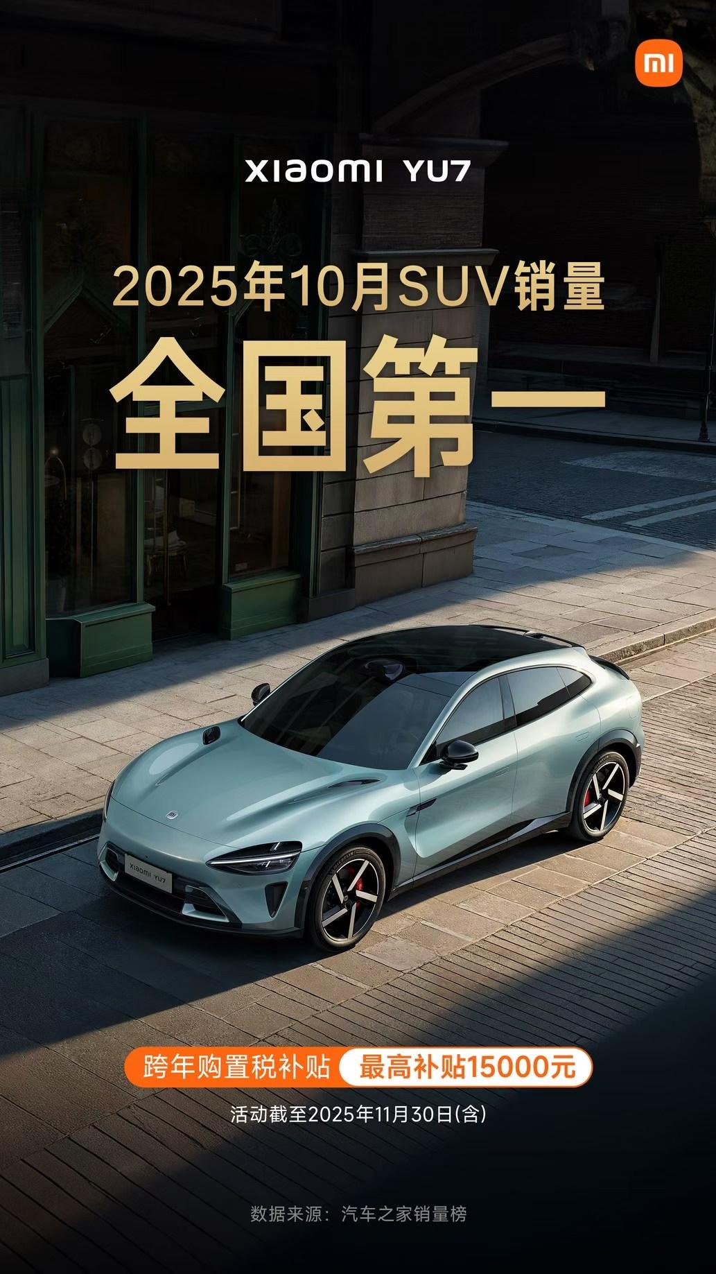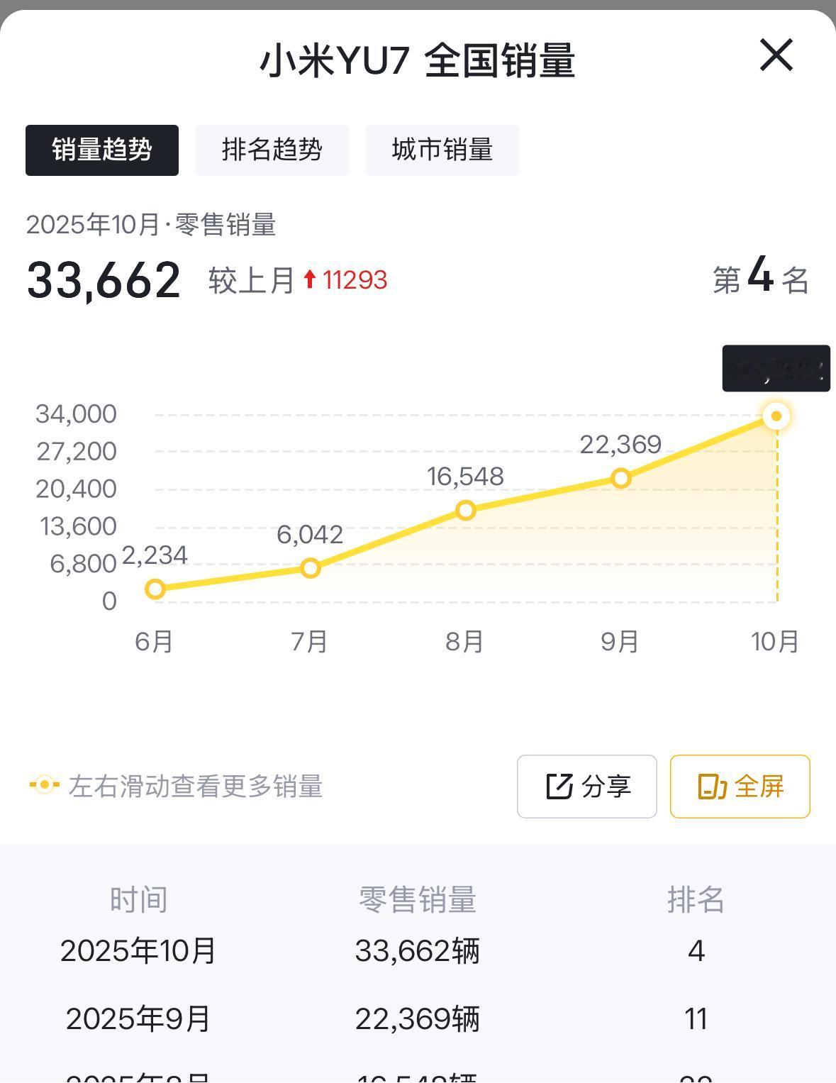 2025年10月小米YU7销量全国第一 就问还有谁? 十月份总共卖了33662辆车,估计有一部分车型是之前产能不够导致的 不得不佩服小米汽车,品牌时间不长但是因为小米手机的口碑表现不错,小米汽车新产品的研发也带动了米粉的喜欢 新媒体时代大ip 的崛起