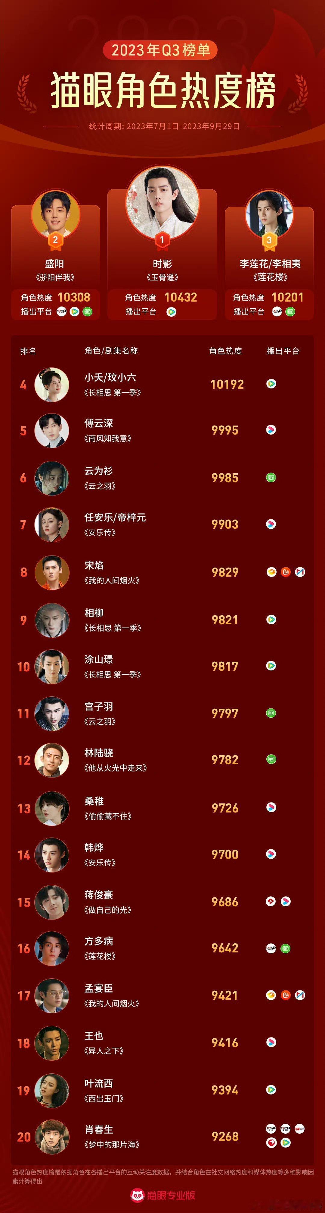 2023年Q3猫眼角色热度榜第一位是时影,第二位是盛阳,都是肖战的角色。时影好仙!