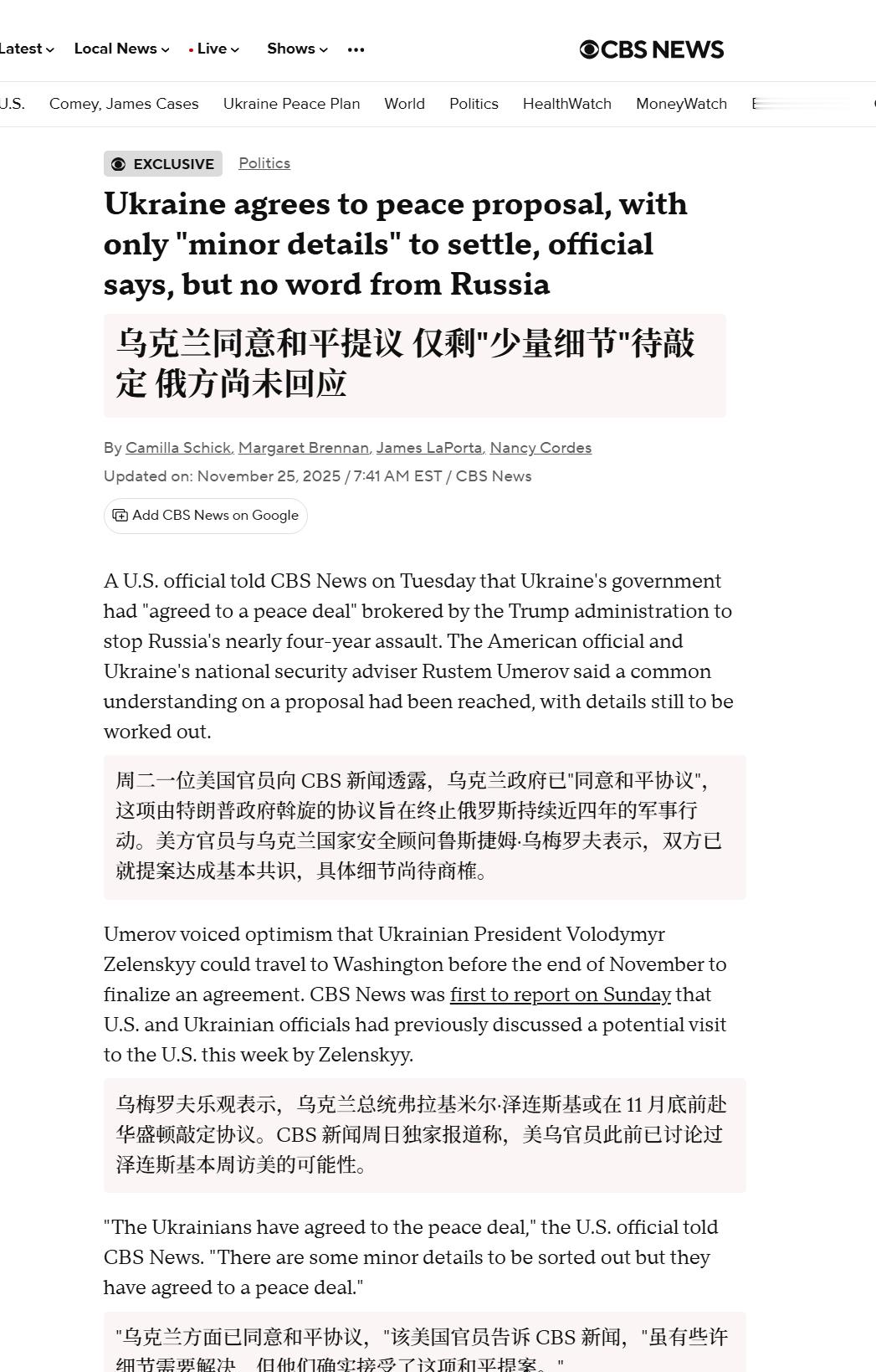 🔻CBS 称:乌克兰已同意接受特朗普提出的结束与俄罗斯战争的全面和平计划条款。“仅剩少量细节待敲定”。