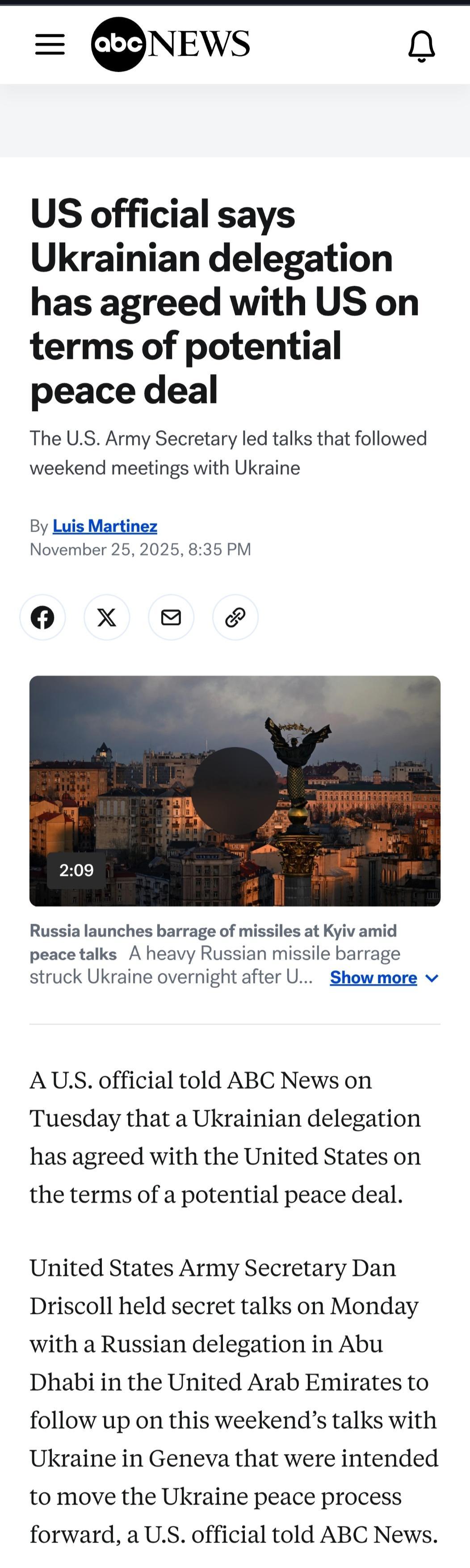 ABC新闻报道,美方称乌克兰代表团已与美国就潜在和平协议原则上谈妥,只剩少量技术细节待定。美陆军部长Dan Driscoll在阿布扎比与俄方代表秘密会谈,衔接上周美乌日内瓦谈判,显示特朗普政府正加速重启停滞的乌克兰和谈进程。协议框架也从原28点压缩到19点,删除了战争行为特赦和限制乌军规模等敏感条款。