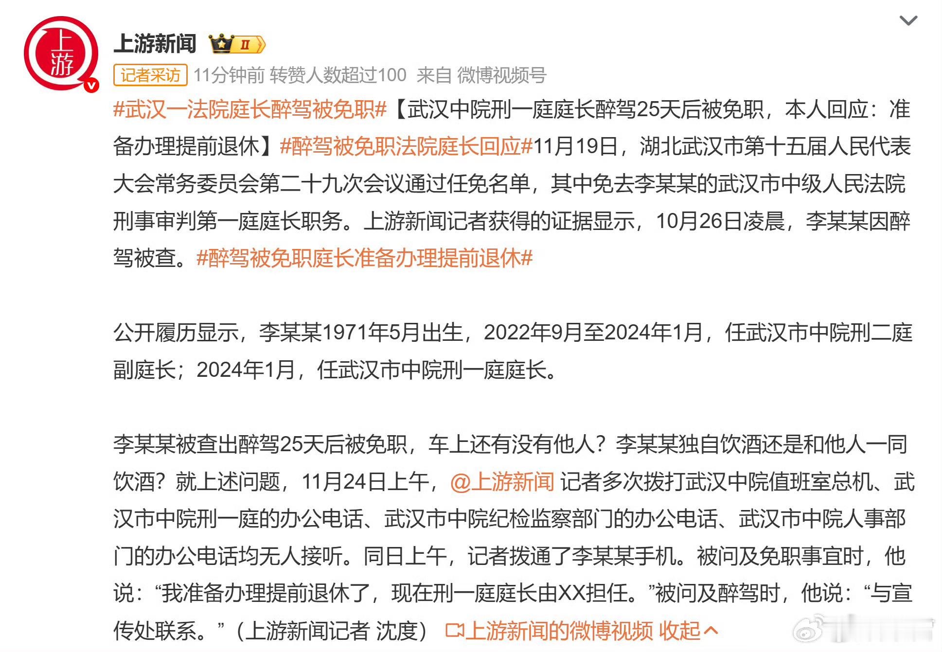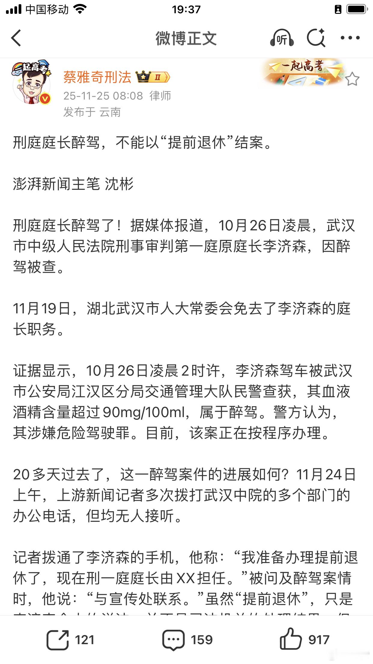 通报来了,武汉醉驾刑庭法官,没法退休,直接被移送到武汉的检察机关审查起诉,这是刑了。注意⚠️看下文,检察院起诉了好不//:这说实话没啥,醉驾不拘留正常,才90mg基本就是不起诉党内和行政会有处分。也不能因为知法犯法就罪加一等吧武汉市中级人民法院11月25日通报,10月26日凌晨,武汉市中级人民法院刑一庭原庭长李某某酒后驾驶机动车被公安机关查获,经检测其血液中酒精含量为91.55mg/100ml,涉嫌危险驾驶犯罪,被公安机关立案侦查。武汉中院获悉情况后,第一时间向公安机关了解情况、向纪检监察机关移送违纪违法线索,并按组织程序免去其职务。11月19日,武汉市第十五届人民代表大会常务委员会第二十九次会议通过对李某某的免职决定。目前,李某某涉嫌危险驾驶犯罪,已移送检察机关审查起诉。感谢社会各界对武汉法院工作的关注与监督。此前,据上游新闻报道,10月26日凌晨,武汉市中级人民法院刑事审判第一庭原庭长李济森,因醉驾被查。11月19日,湖北武汉市第十五届人民代表大会常务委员会第二十九次会议通过任免名单,其中免去李某某的武汉市中级人民法院刑事审判第一庭庭长职务。证据显示,10月26日凌晨2时许,李济森驾车被武汉市公安局江汉区分局交通管理大队民警查获,其血液酒精含量超过90mg/100ml,属于醉驾。警方认为,其涉嫌危险驾驶罪。目前,该案正在按程序办理。11月24日,记者拨通了李某某手机。被问及免职事宜时,他说:“我准备办理提前退休了,现在刑一庭庭长由XX担任。”被问及醉驾时,他说:“与宣传处联系。” 【刑庭庭长凌晨醉驾被当场查获,武汉中院通报】