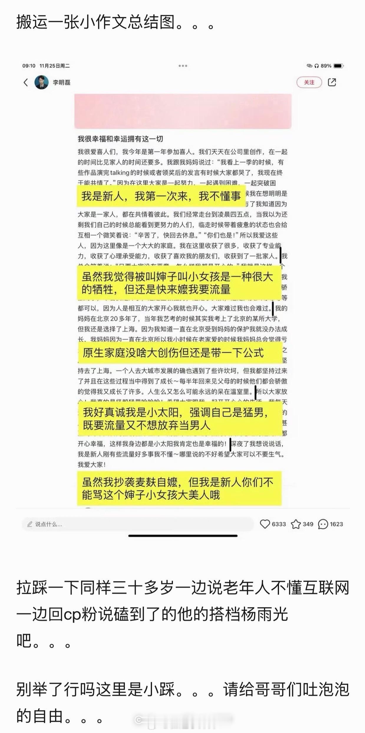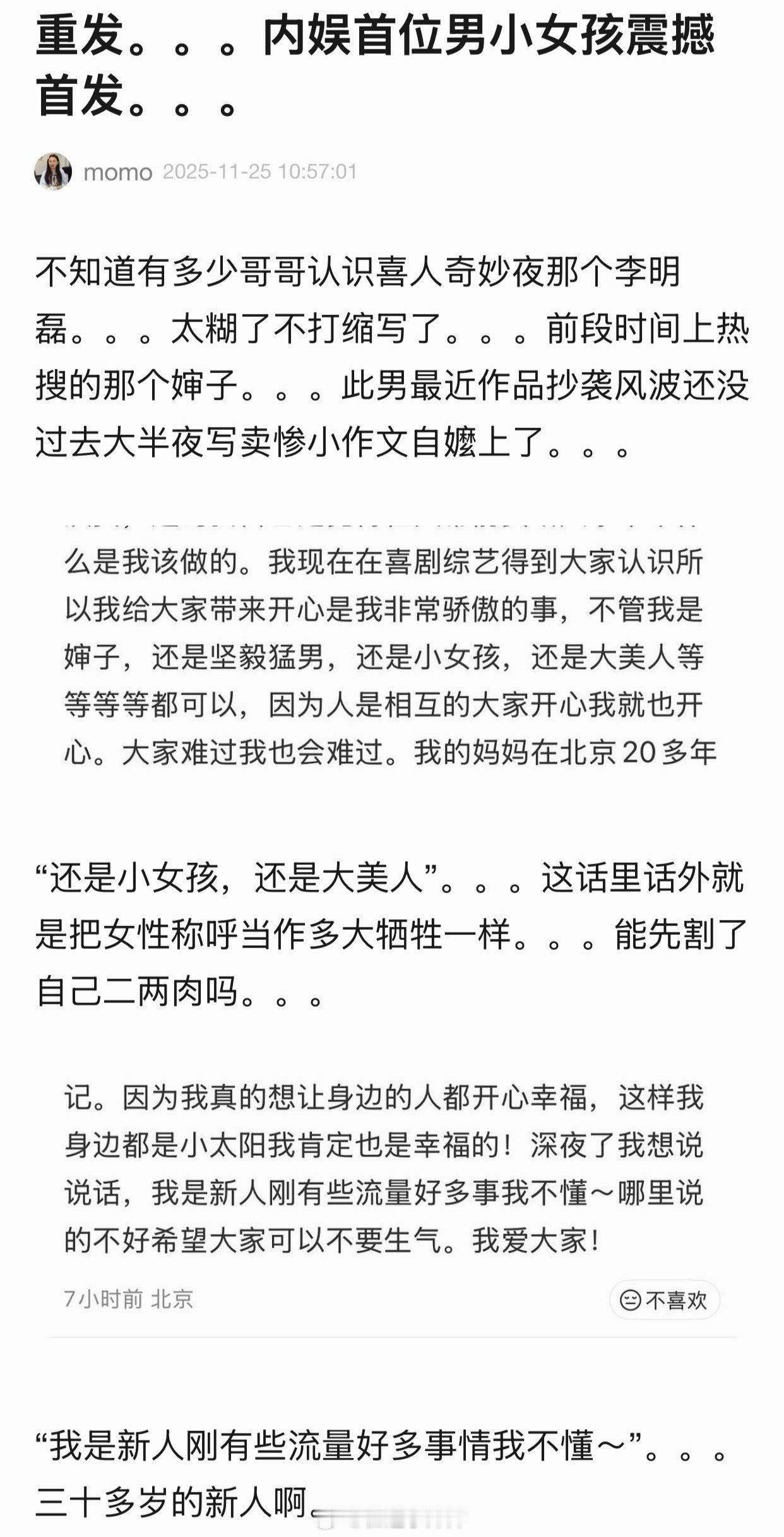 喜人李明磊写的小作文“不管我是婶子…还是小女孩,还是大美人”现在内娱男都爱这么说话吗
