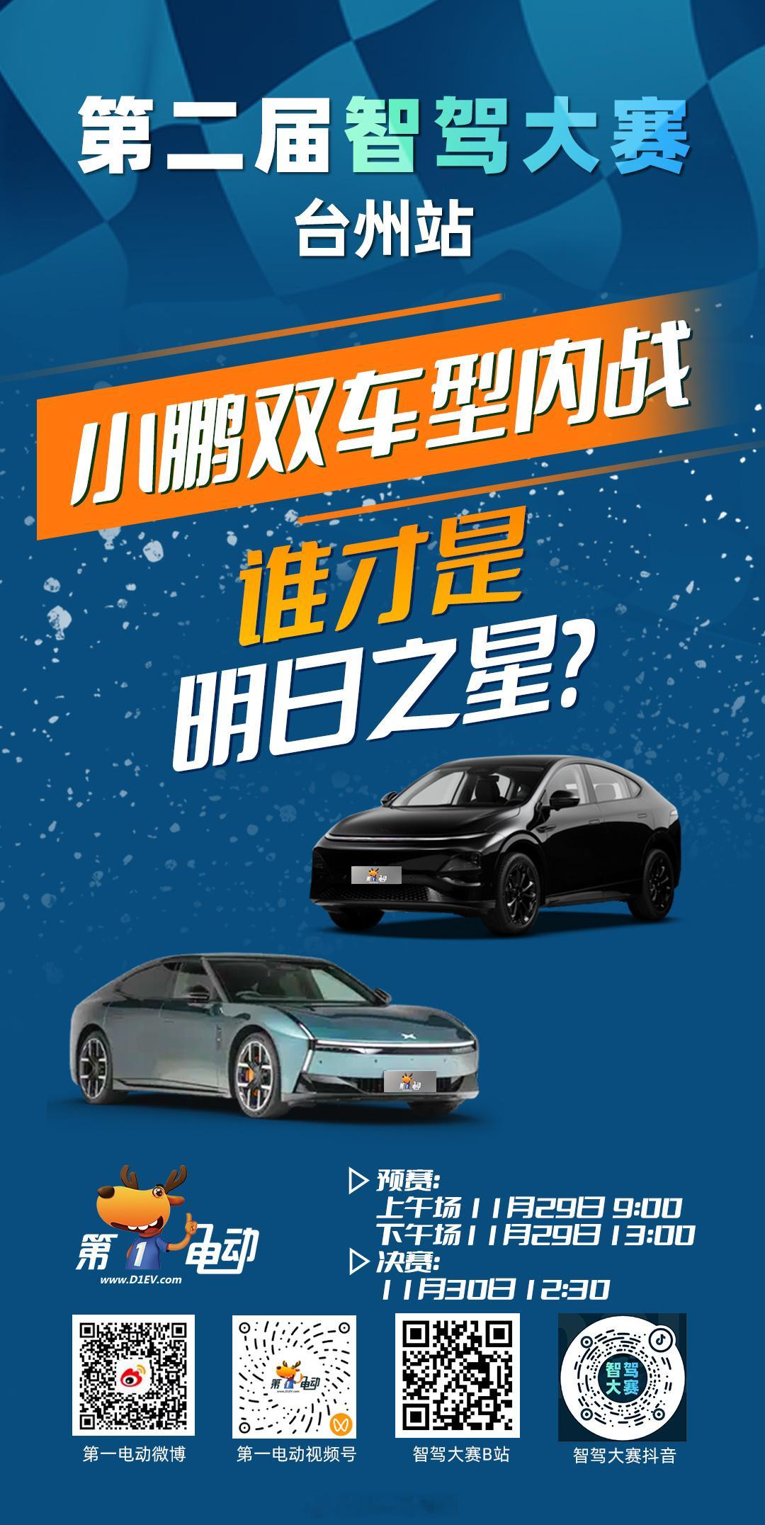 预热第二天之【小鹏系PK】即将打响!小鹏双雄,同门先来一场较量!激光雷达方案 vs VLA纯视觉方案两条技术路线,谁能代表小鹏进入决赛?谁,才是「明日之星」? 你将站哪一队?坚定小鹏G6激光派力挺小鹏VLA视觉派为你看好的路线打Call!⏰ 直播锁定:预赛:11月29日 上午9:00 & 下午1:00决赛:11月30日 中午12:30见证小鹏系晋级名额的诞生!📺 直播平台:第一电动 微博 | 视频号智驾大赛 B站 | 抖音多位专业博主/大V同步在线直播,一起期待!