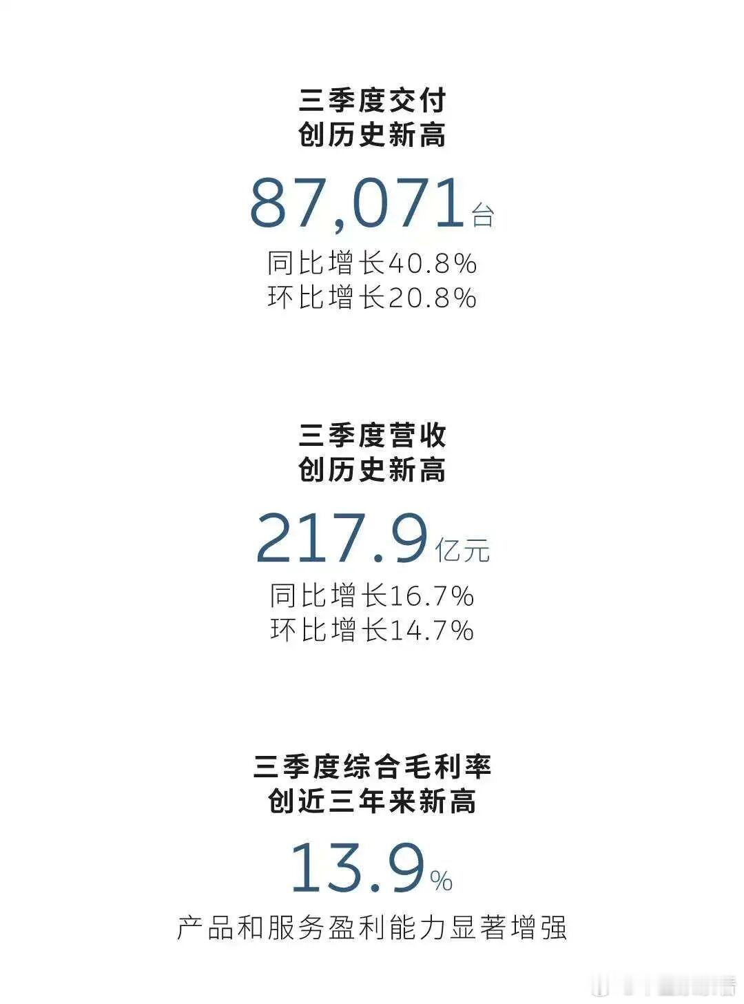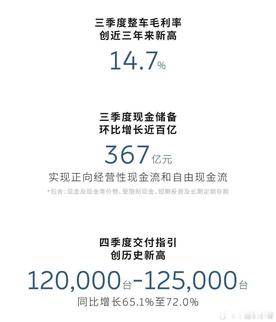 四季度盈利有戏?蔚来发布亮眼三季报11月25日,蔚来发布2025年三季度财报。具体来看,蔚来公司三季度交付新车87,071台,同比增长40.8%,环比增长20.8%,创历史新高。销量的增长也带动蔚来财务数据的增长。蔚来三季度总营收达到217.9亿元,同比增长16.7%,环比增长14.7%,创历史新高;综合毛利率13.9%,创近三年来新高,产品和服务盈利能力显著增强;整车毛利率14.7%,创近三年新高。此外,蔚来三季度现金储备达367亿元,实现正向经营性现金流和自由现金流;运营亏损为35.215亿元,同比减少32.8%,环比下降28.3%;调整后净亏损(非公认会计准则)为27.351亿元,同比下降38.0%,环比下降33.7%。展望未来,蔚来四季度交付指引为120,000台至125,000台,同比增长65.1%至72.0%,创历史新高。营收指引327.6亿元至340.4亿元,同比增长66.3%至72.8%,创历史新高。 (原创/欢欢)