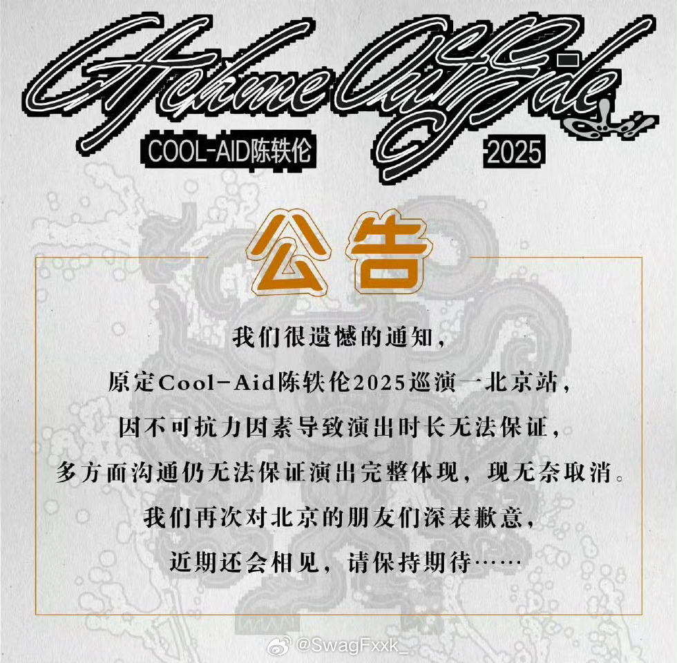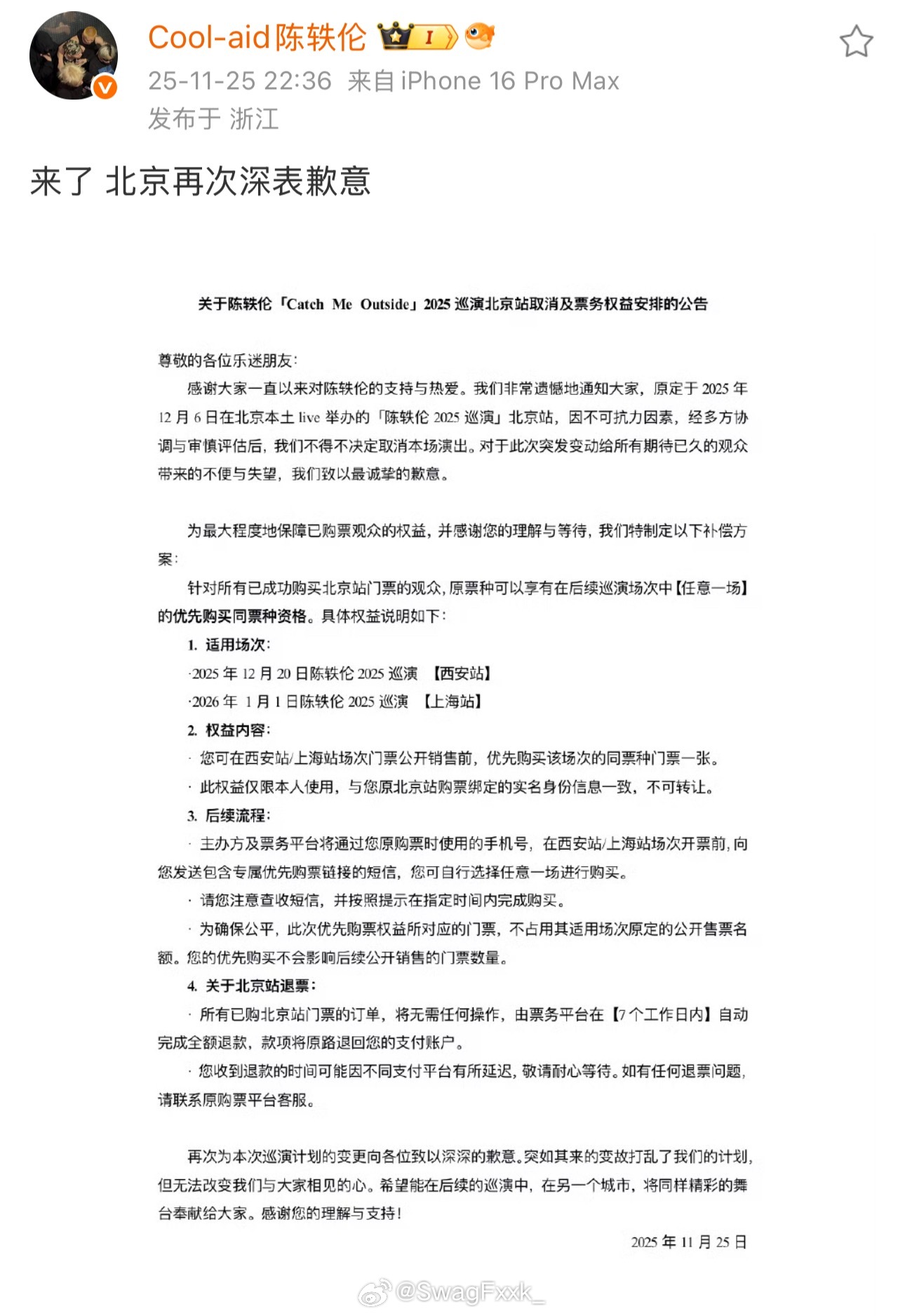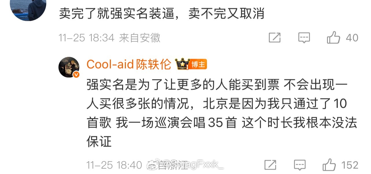 陈轶伦官宣北京站巡演因不可抗力取消!并对此道歉有网友怼陈轶伦强实名装b,卖不完又取消,陈轶伦对此回应:强实名是为了更多人买到票,北京站是因为只通过了10首歌,时长没法保证。